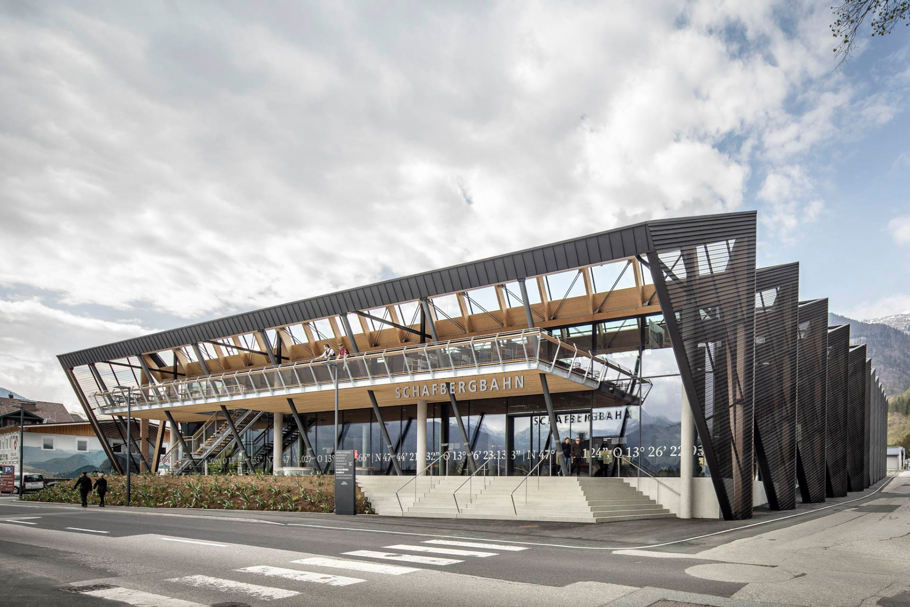 Die neue Talstation der Schafbergbahn im Salzkammergut vermittelt zwischen Berg und See, Landschaft und Dorfstruktur. Wesentlich hierfür ist die gefaltete Dach- und Fassadenkonstruktion aus Holz und Stahl.