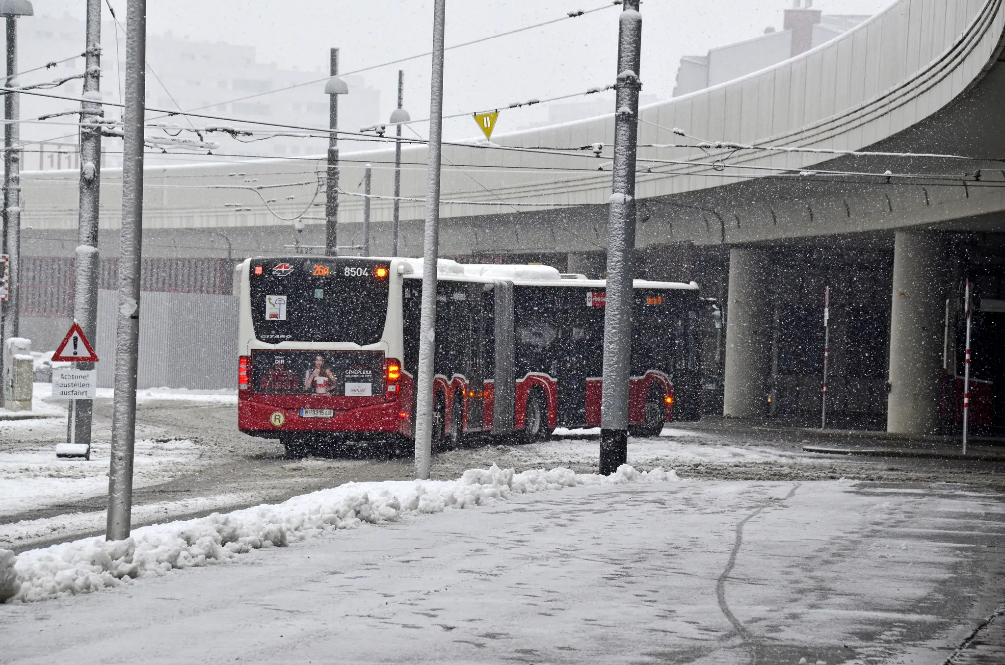Das Wiener Wetter ist am Freitag voll auf Winterkurs. Neben dem Dauerfrost schneit es am Vormittag auch noch recht ergiebig. Vor allem auf Öffi-Busse hat dies Auswirkungen. Kaum ein Eck in Wien bleibt davon verschont.
