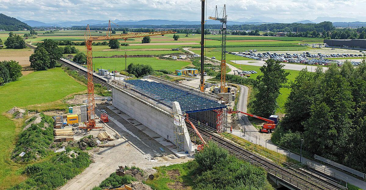 Die neue Brücke im Bereich des Bahnhofes Schalchen-Mattighofen. Das Überführungsbauwerk ist 17,70 Meter lang, zirka zehn Meter hoch und mit 48,90 Metern überaus breit. Es ist eine von vielen Sommerbaustellen ...