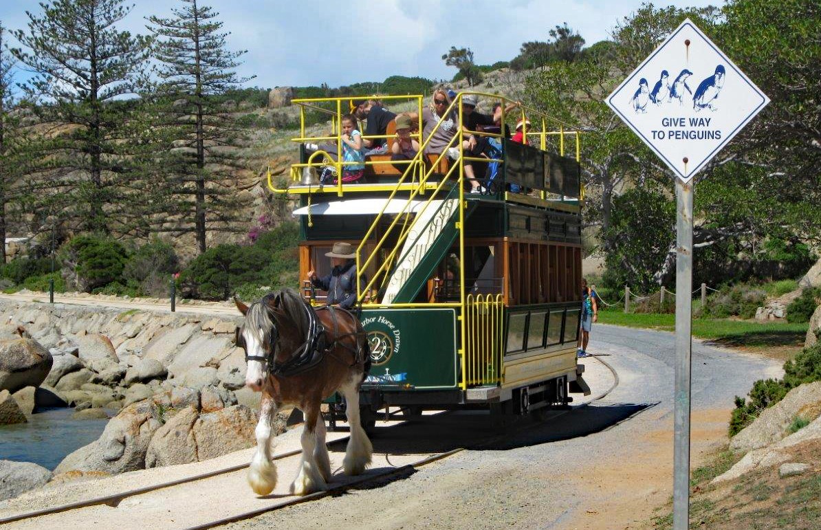 Pferdebahn in Victor Harbor Südaustralien, Pinguine haben Vorrang, auch vor der Pferdebahn!