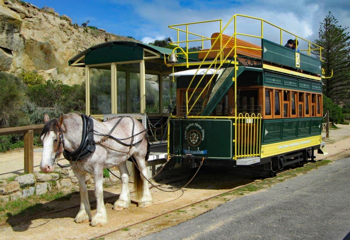 Victor Harbor, eine Kleinstadt mit ca. 10.000 Einwohnern verfügt über einen städtischen Pferdebahnbetrieb der rund um das Jahr, täglich für die Verbindung vom Bahnhof über eine 630m lange Holzbrücke zum Granite Island sorgt.