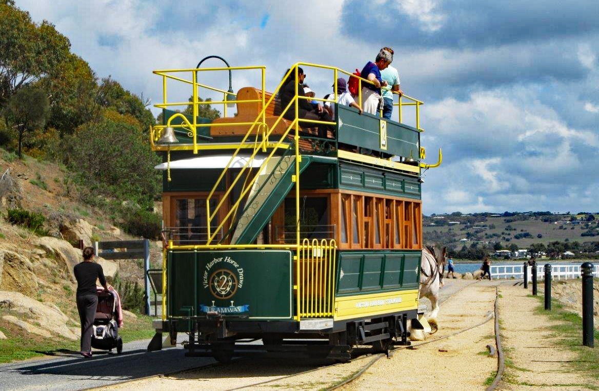 Auch wenn sie natürlich eine touristische Attraktion ist, ist sie doch ein Verkehrsmittel für den Alltagsgebrauch, die Pferdebahn von Victor Harbor im Süden Australiens. Victor Harbor, eine Kleinstadt mit ca. 10.000 Einwohnern verfügt über einen städtischen Pferdebahnbetrieb der rund um das Jahr, täglich für die Verbindung vom Bahnhof im Stadtzentrum über eine 630m lange Holzbrücke zum Granite Island sorgt. Auf der Insel befindet sich u.a. der Schiffsanleger von Victor Harbor und darin ist auch der Ursprung der Pferdebahn zu suchen. 1864 erreichte die breitspurige Eisenbahn von Goolwa das Städtchen Victor Harbor.