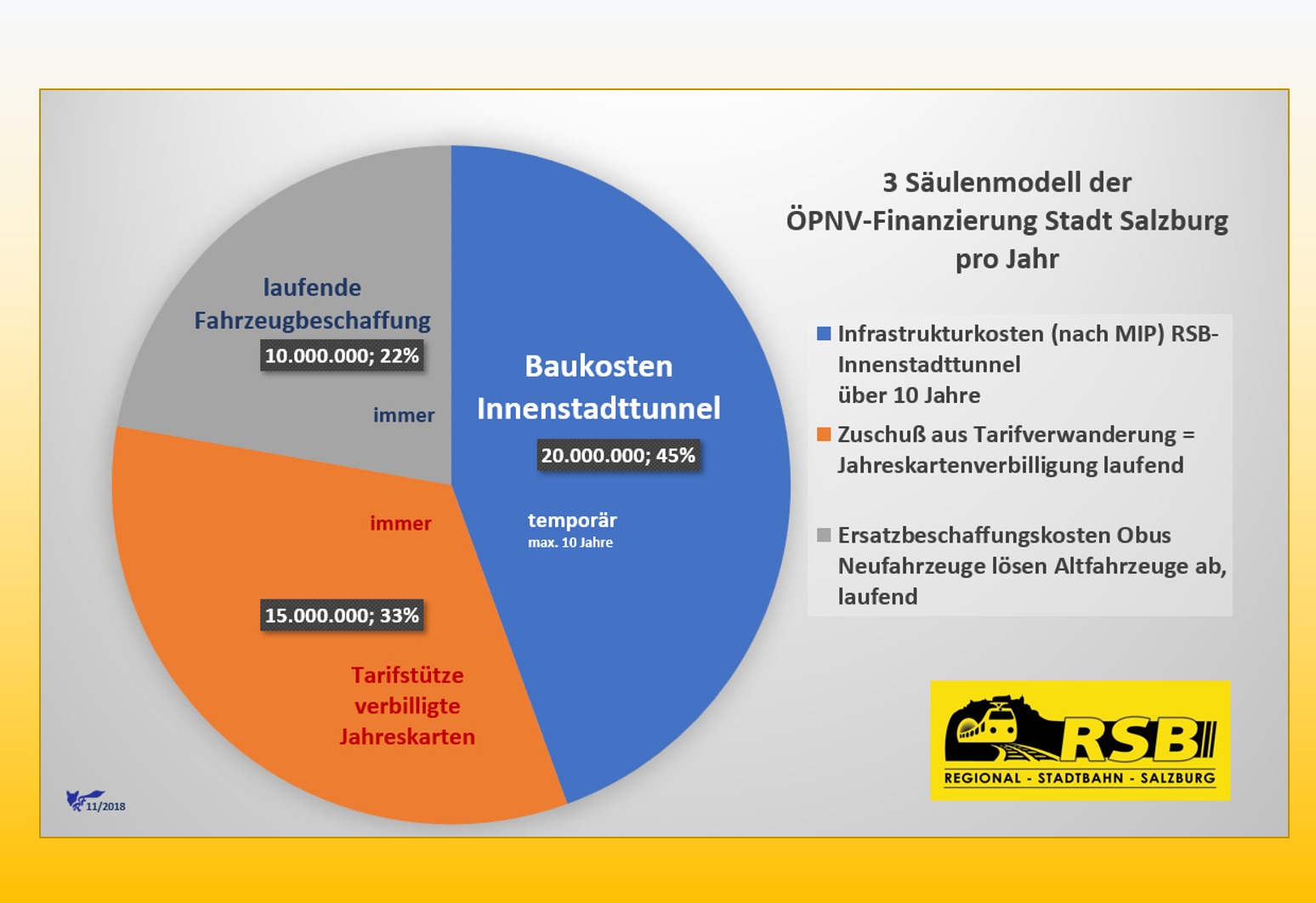 Der Innenstadttunnel der Lokalbahnverlängerung durch die Stadt und oberirdisch weiter bis Hallein, hat nach heutigem Stand ein Kostenvolumen von rund 600 Millionen Euro. Diese 600 Millionen werden vom Bund, über das MIP, zur Hälfte finanziert. Die andere Hälfte teilen sich über 10 Jahre Stadt und Land Salzburg, was jeweils einen jährlichen Anteil von 15 Millionen Euro bedeutet.