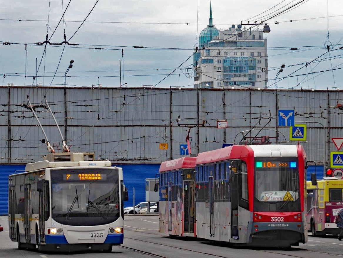 St. Petersburg Obusse, Der Oberleitungsbus 3335 (Trans-Alpha / 2012) der Linie 7 trifft auf die bidirektionale Straßenbahn 3502 der Linie 10 am Krasnogvardeyskaya-Platz.