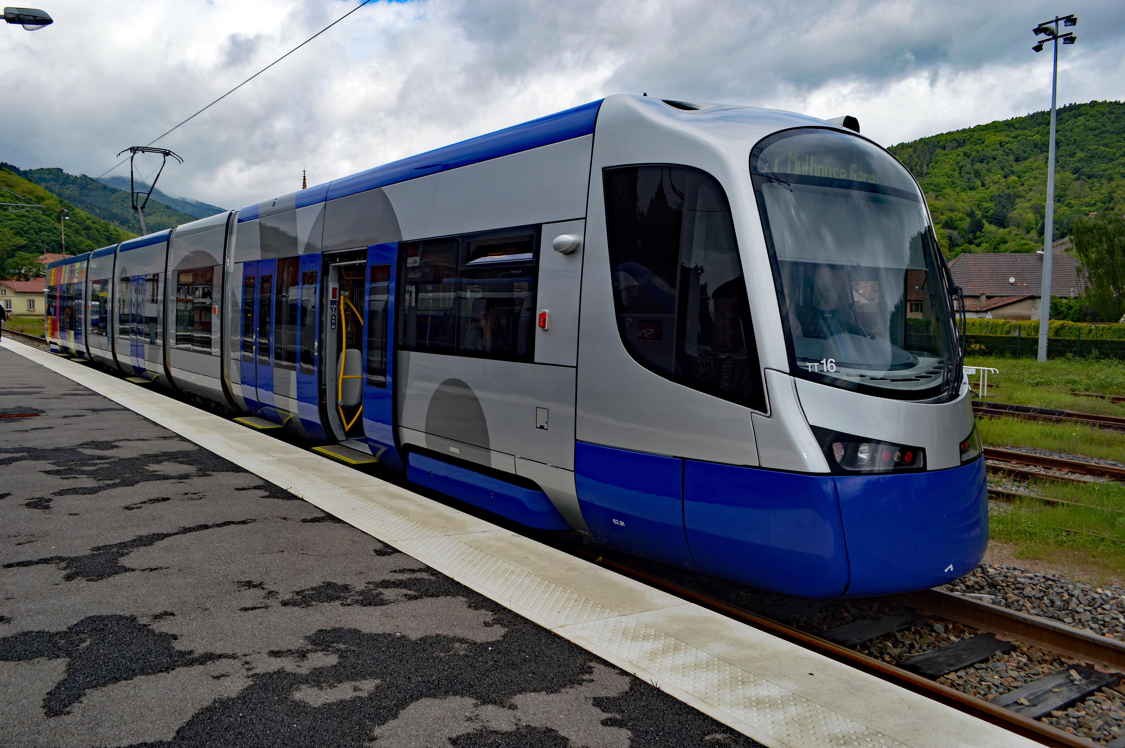 TramTrain Mulhouse, die Regionalstadtbahn von Mülhausen in Frankreich, fährt in der Stadt auf Straßenbahngleisen und in der Region Richtung Thann auf den Gleisen der SNCF, den Französischen Staatsbahnen.