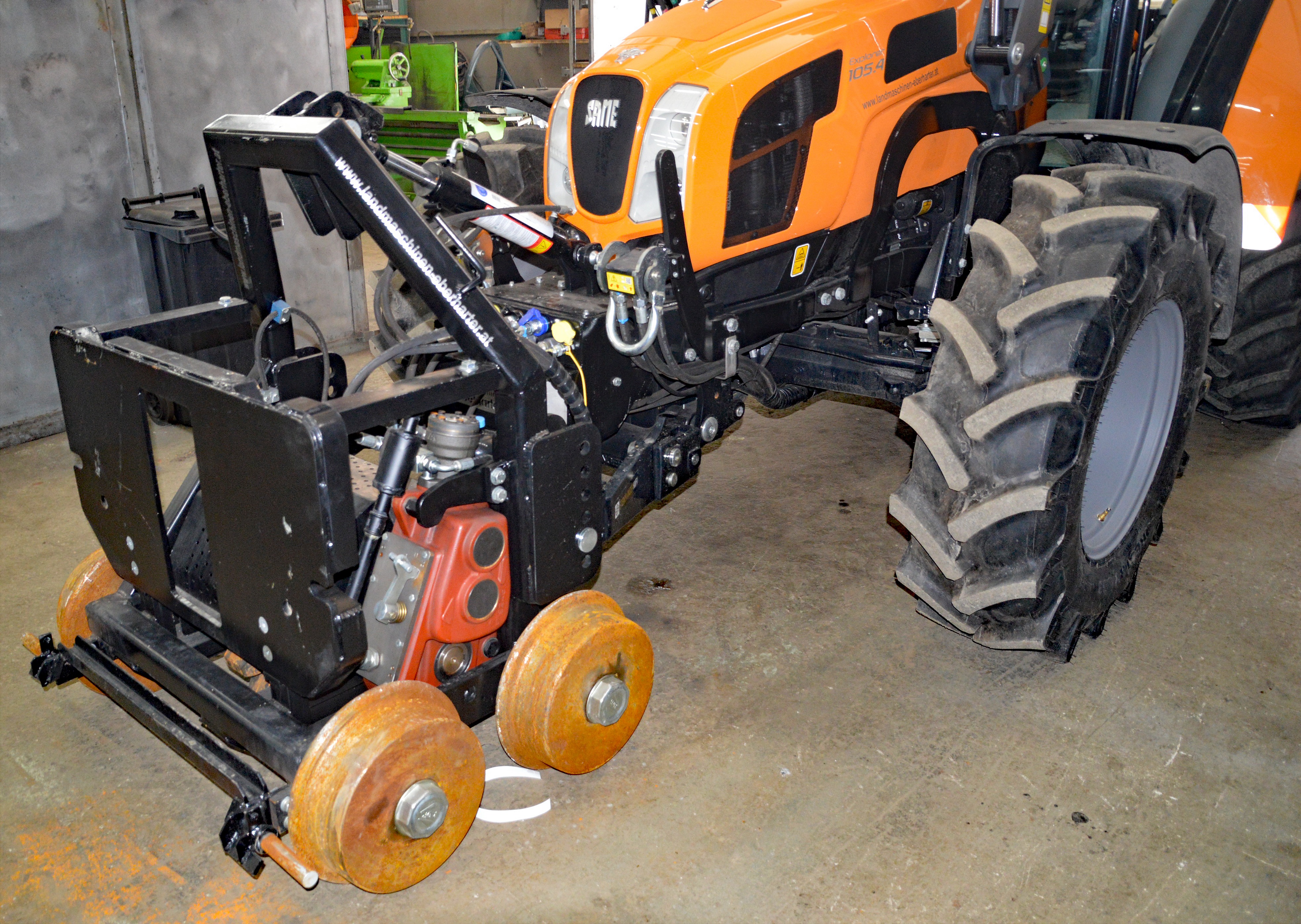 Das meterspurige Antriebswägelchen mit Zahnradantrieb ist ein Mehrkomponententräger, der mittels Hydraulikleitungen Mähbalken, Kräne und Anhängewagen für Bäume und andere Komponenten für diverse Aufgaben aufstecken kann, eben ein "Schweizer Messer".