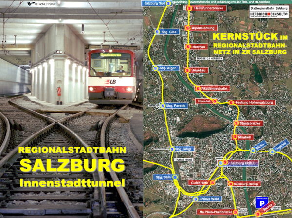 Der "Arbeitskreis Regionalstadtbahn Salzburg" unter Dr. Horst Schaffer 2005 empfahl die Variante "1c kurz" als die effizienteste Innenstadt-Durchfahrt der Regionalstadtbahn durch Salzburg. Auf dem Satelliten-Plan sind die Lokalbahnhaltestellen rot unterlegt und die auf den Bundesbahnstrecken in blau. Satellitenplan von DI Rainer Herbrich
