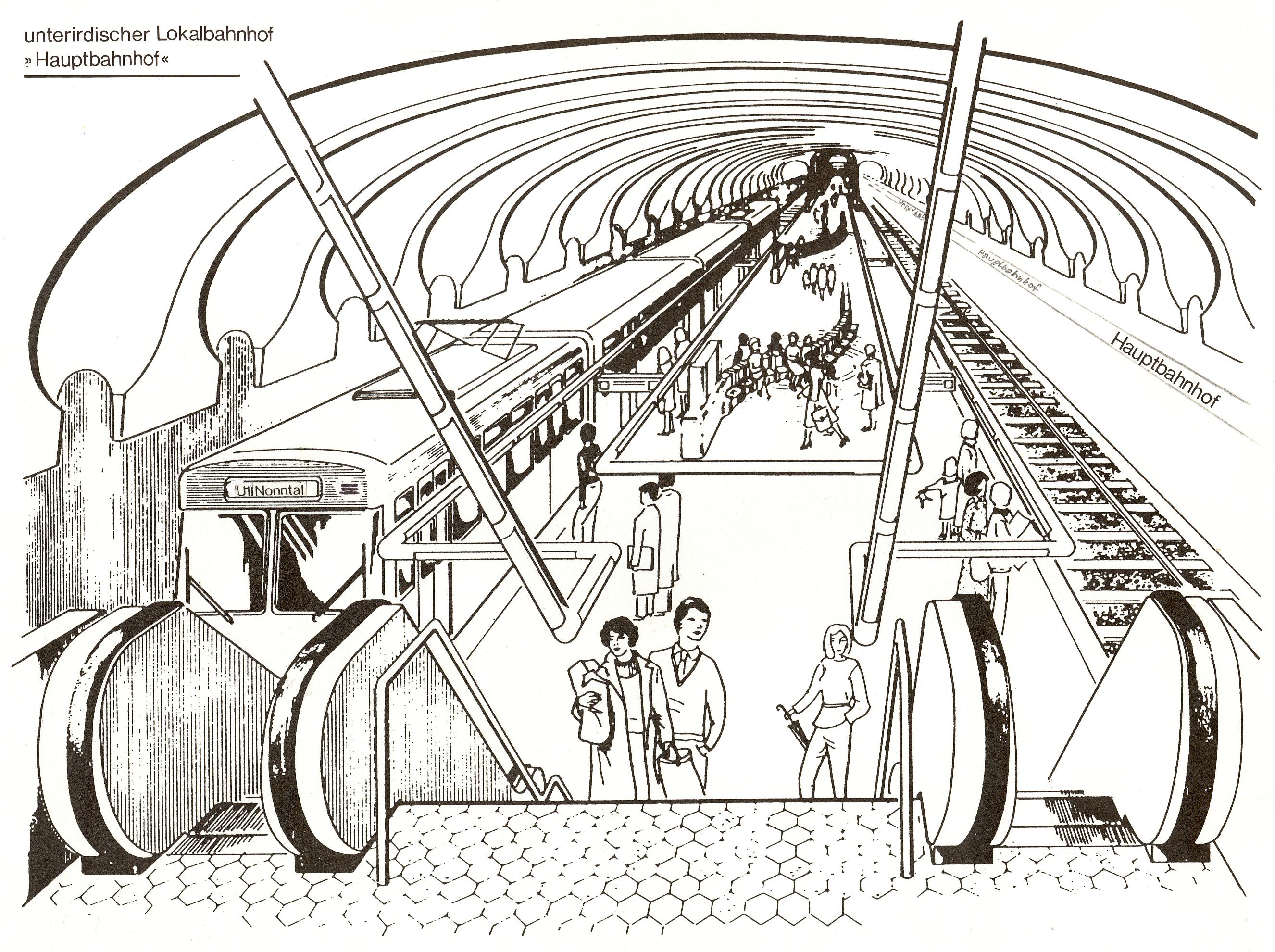 Zeichnung unterirdische Stadtbahnstation in Frankfurt, von der "Aktionsgemeinschaft Rote Elektrische", vor vielen Jahren als Visualisierung von Salzburg Hauptbahnhof tief.