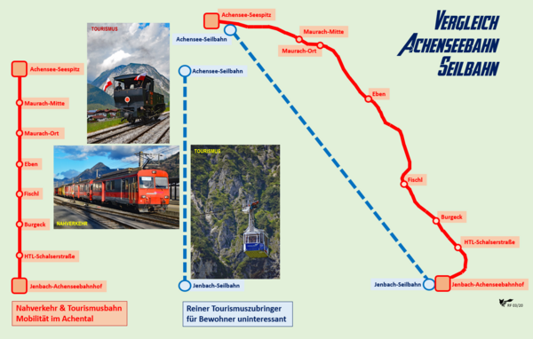 Österreich kann stolz auf die weltweit erfolgreiche Seilbahn-Industrie sein. Allerdings ist es unerträglich, dass immer wieder Seilbahnprojekte in die Diskussion gebracht werden, um Eisenbahnprojekte in Frage zu stellen. In Salzburg wurden HTL-Schüler dazu missbraucht, das Regionalstadtbahn-Netz in Frage zu stellen. Nun soll eine Seilbahn zum Achensee die Achenseebahn ersetzen. Die benötigten öffentlichen Finanzmittel, die die Achenseebahn für die Weiterentwicklung zu einer modernen Nahverkehrsbahn dringend gebraucht hätte, soll, so der politische Wille, einer Seilbahn nachgeworfen werden. Eine Seilbahn, die nur eine Einstiegs- und eine Ausstiegsstelle hat, kann nur punktuell Fahrgäste befördern. Eine Eisenbahn hat, entlang einer Bahnlinie, wie auf einer Perlenschnur aufgefädelt, viele Haltestellen zum Ein- und Aussteigen.