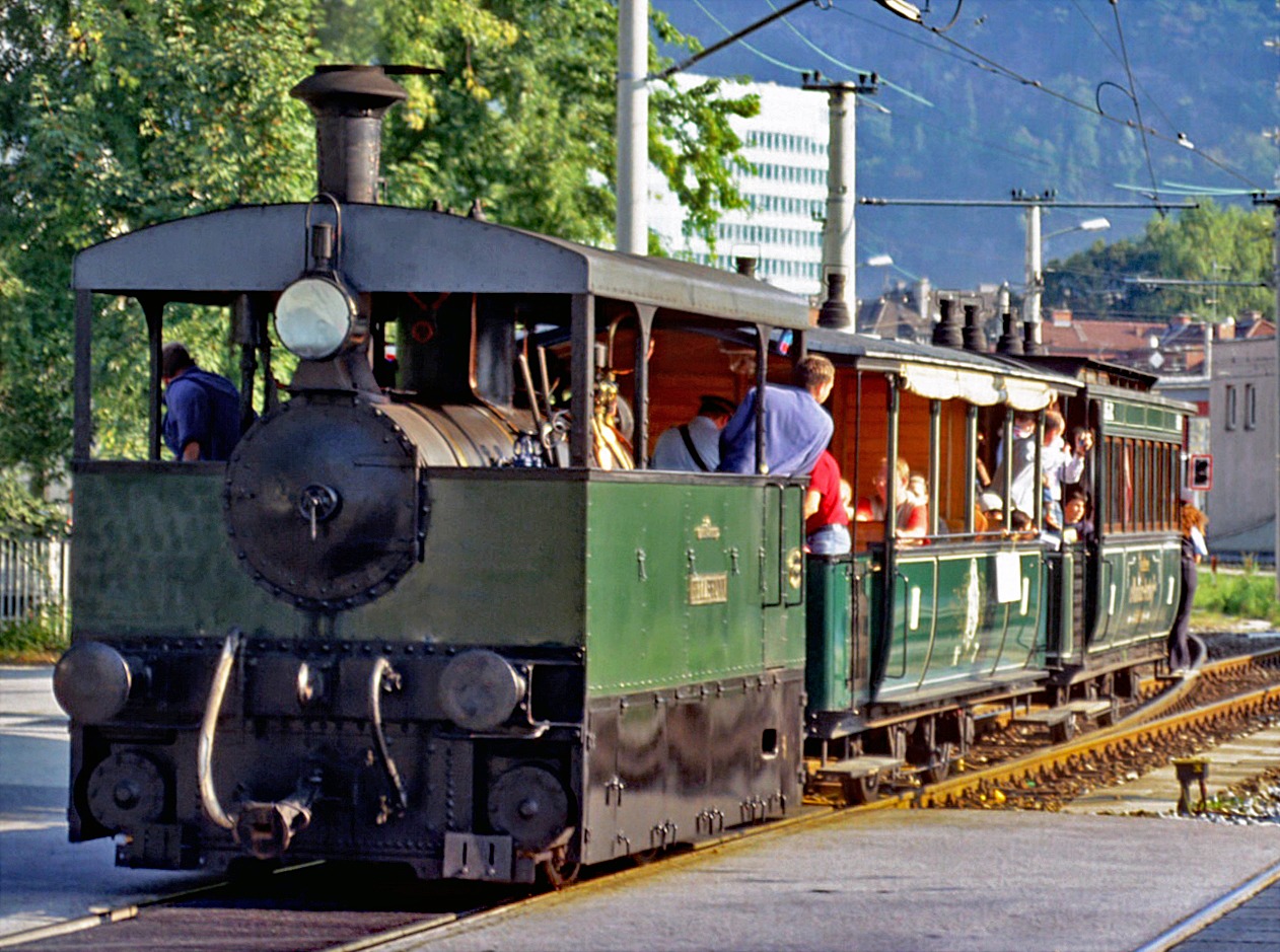 Würthle & Co. Die Lok 6 "Gartenau", 1887 gebaut, steht heute im Technischen Museum Prag. Die Dampftramway hatte 1886, zunächst bis Hellbrunn, dann bis Drachenloch den Betrieb aufgenommen. Die Strecke wurde 1907 bis Berchtesgaden erweitert.