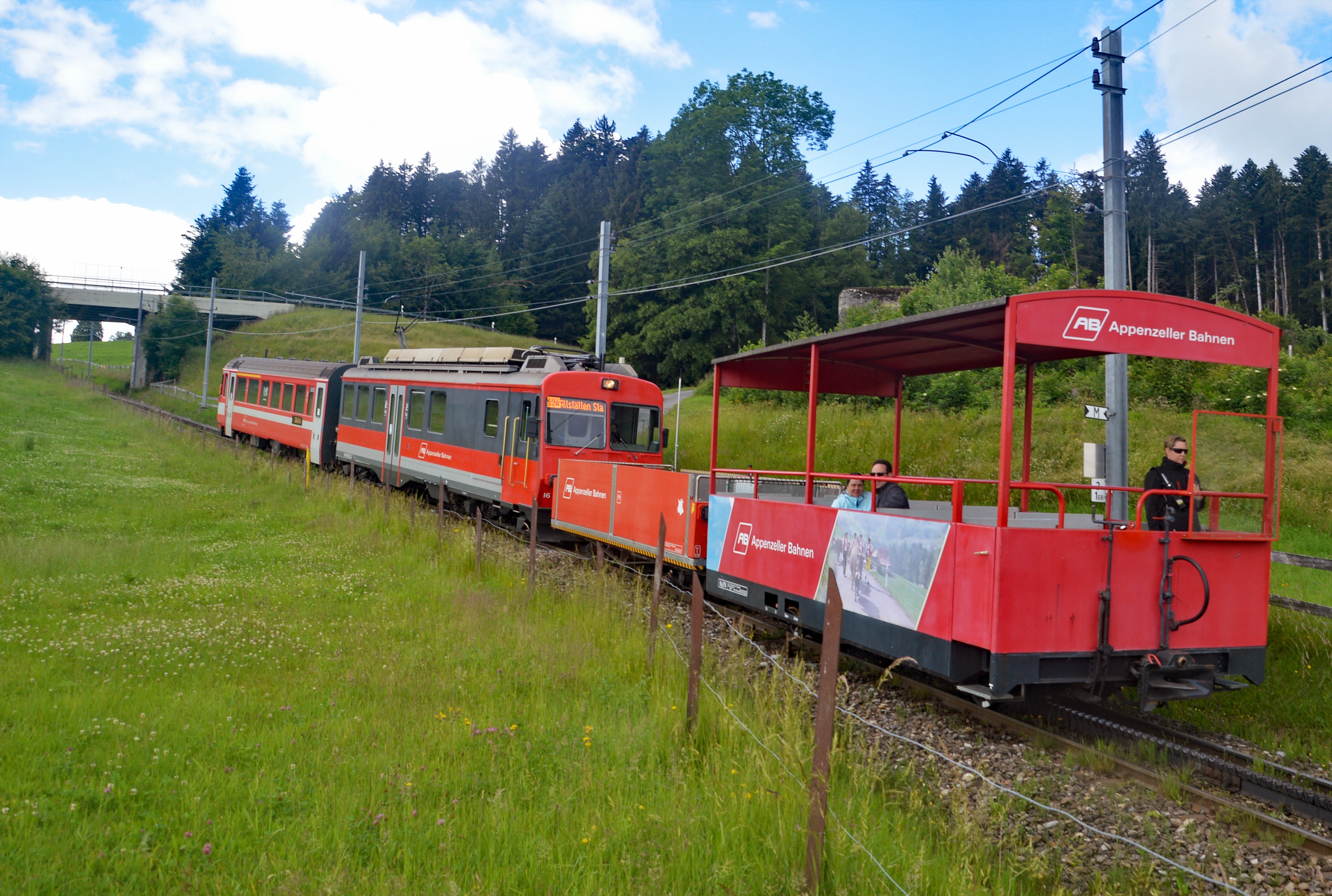 Appenzellerbahn Gais - Altstätten Steilstrecke Haltestelle Kreuzstraße Zahnradbahn-Triebwagen ET 17 mit Vorstellwagen, Sommerwagen