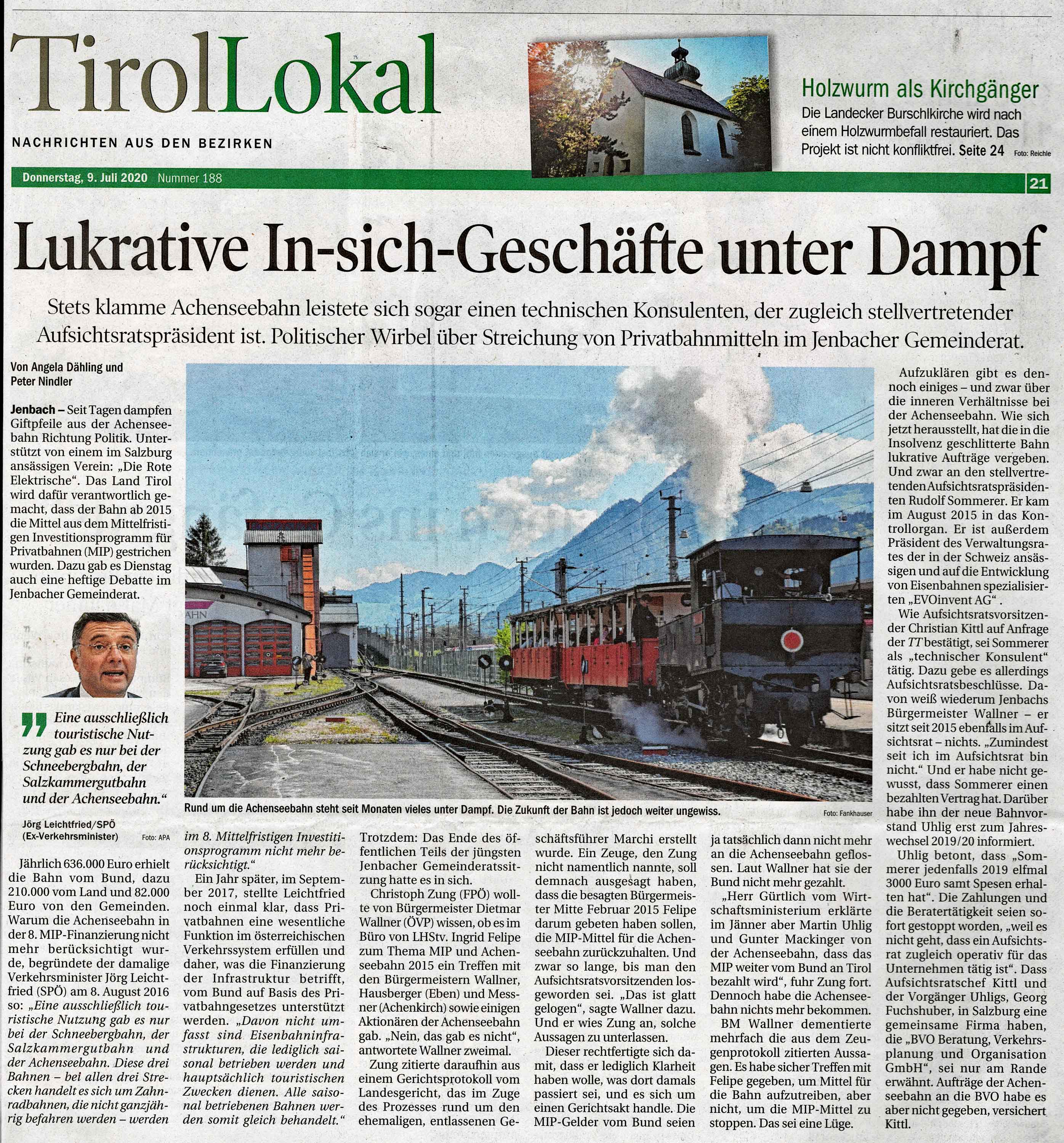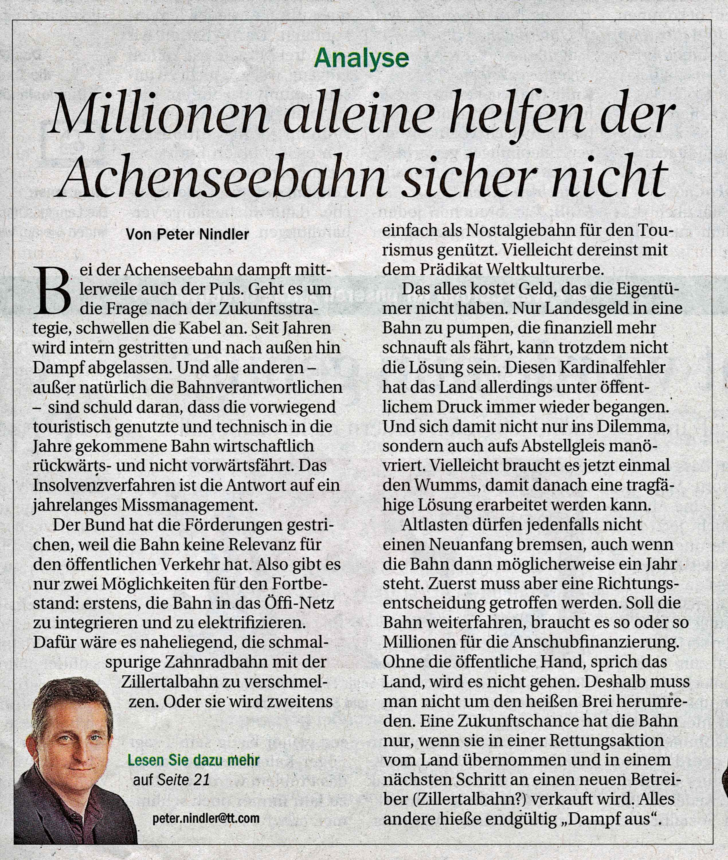 Ich lese immer sehr gerne Ihre Kolumnen in der TT und habe Sie bisher für einen korrekten und nicht parteiorientierten Journalisten gehalten. Ihr Artikel in der heutigen TT über die Achenseebahn ist eindeutig von Herrn Geisler diktiert. Warum wird nie mit fachlich kompetenten Personen gesprochen, hat man Angst, daß zuviel Wahrheit ans Tageslicht kommt.