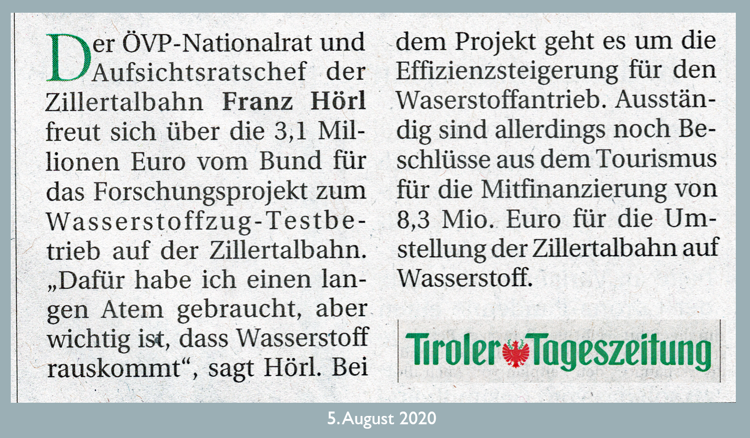Selten genug bekennt sich ein Politiker so offen dazu, dass er Gelder widmungswidrig an ein anderes Bahnunternehmen abzweigt. „Zufällig“ machen genau die vom Land Tirol, in einem Verschwörungsgespräch von LH-Stv. Felipe mit den Achenseebahn-Bürgermeistern am 16.2.2015 beschlossenen Finanzierungsboykott gegenüber der Achenseebahn 3,1 Mio Euro aus. Damit ist der Betrag aus den verweigerten MIP-Mitteln „zufällig“ deckungsgleich mit den 3,1 Mio. für das Wasserstoffexperiment der Zillertalbahn. Noch besser kann das nicht, wie in diesem Artikel in der Print-Version der Tiroler Tageszeitung am 5. August 2020, zugegeben werden: