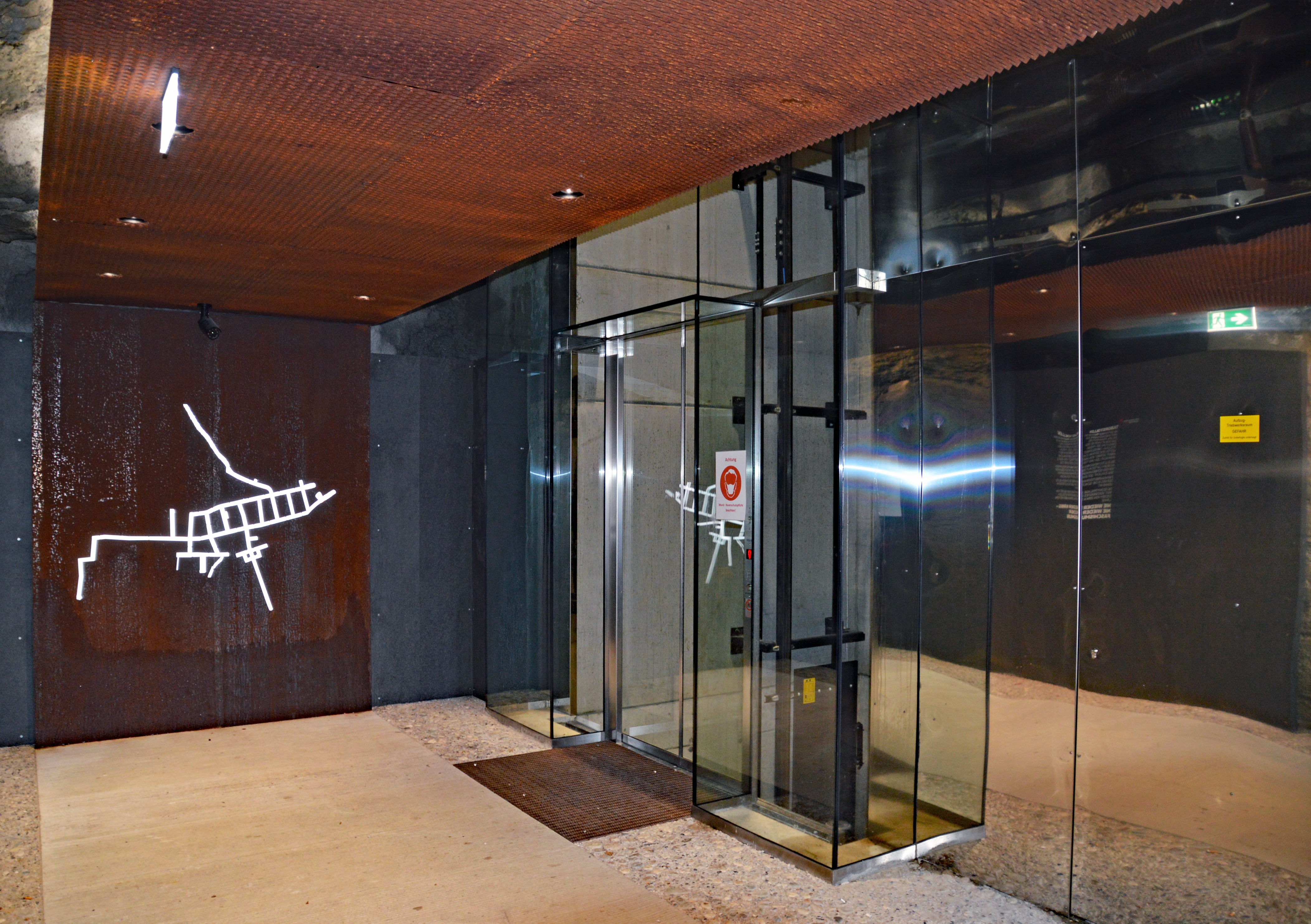 Der Zugang zum Taborlift in Steyr, der kostenlos benützt werden kann, ähnelt in der Talstation der Eingangshalle eines Geschäftshauses, allerdings über einen Zugang im Stollen. Außen an der Felswand ist der Lift relativ unauffällig!