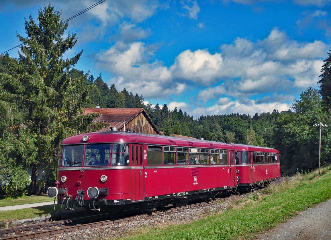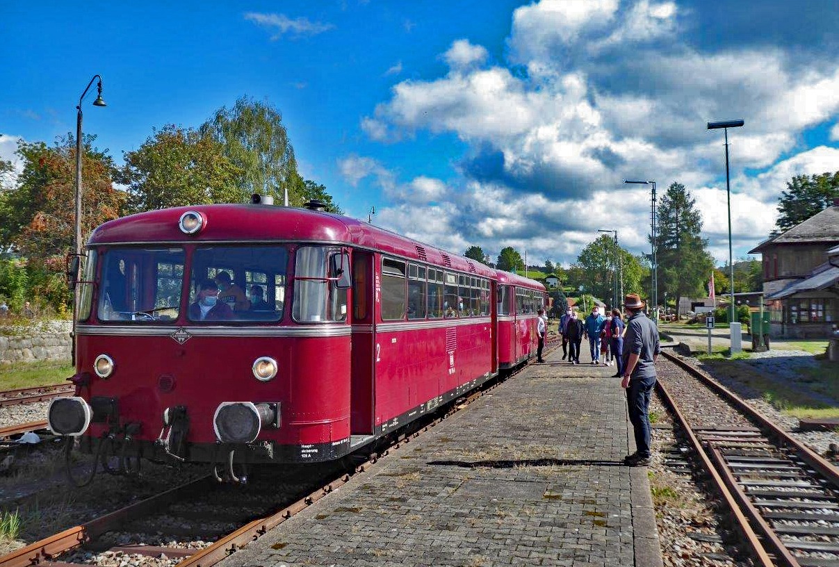 Passau - Freyung: In der Nachsaison 2020 kam eine zweiteilige Schienenbusgarnitur der Passauer Eisenbahnfreunde zu Planzug-Ehren, hier 798 706 + 998 840 in Waldkirchen, dem einstigen Verzweigungsbahnhof in Richtung Haidmühl - Wallern