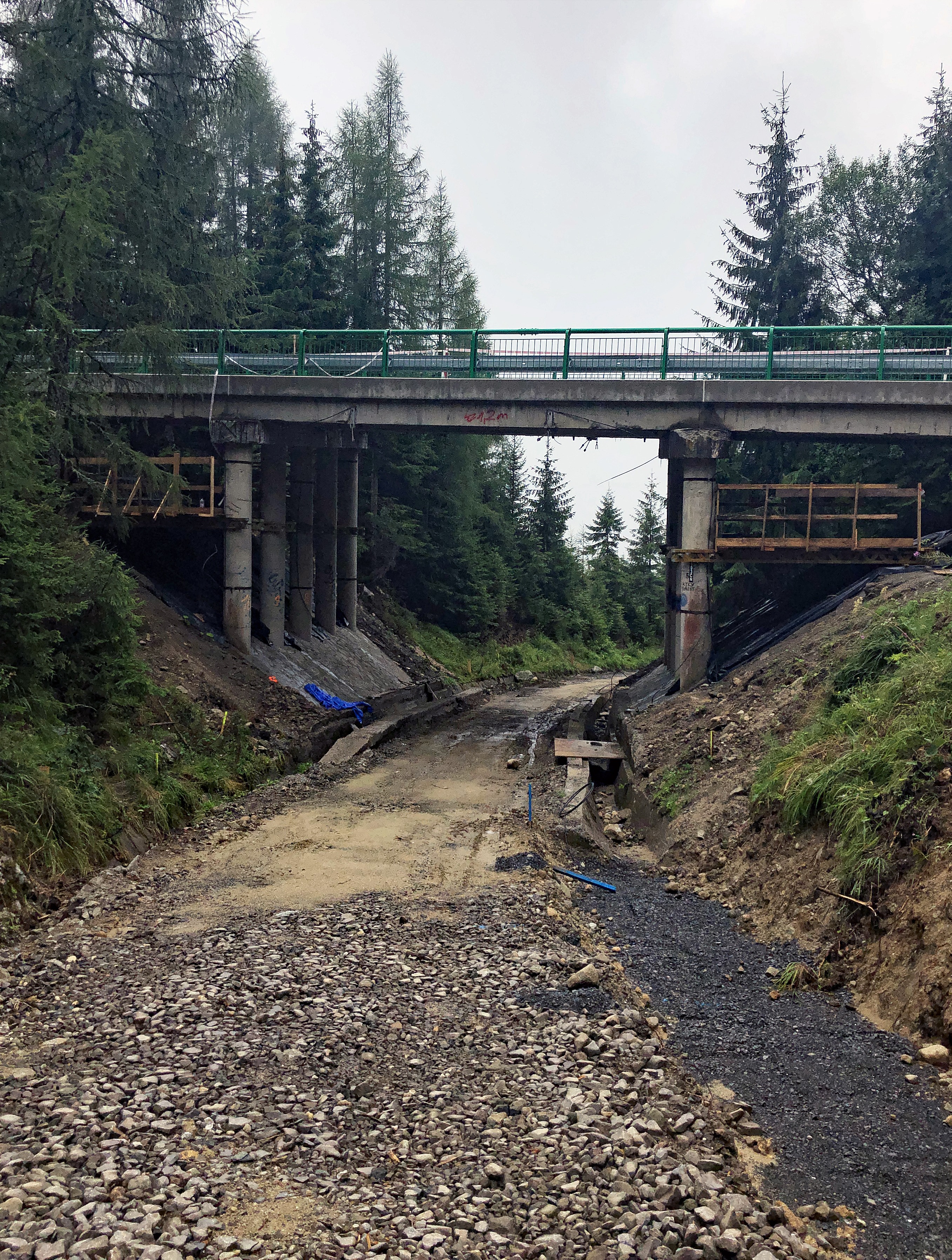 Auch hier eine Gegenüberstellung 2017 die Brücke über die Straße bei Štrba mit Zug und 2020 von oben, wobei es den Anschein hat, dass auf der Brücke die alten Fahrleitungsmasten erhalten bleiben.