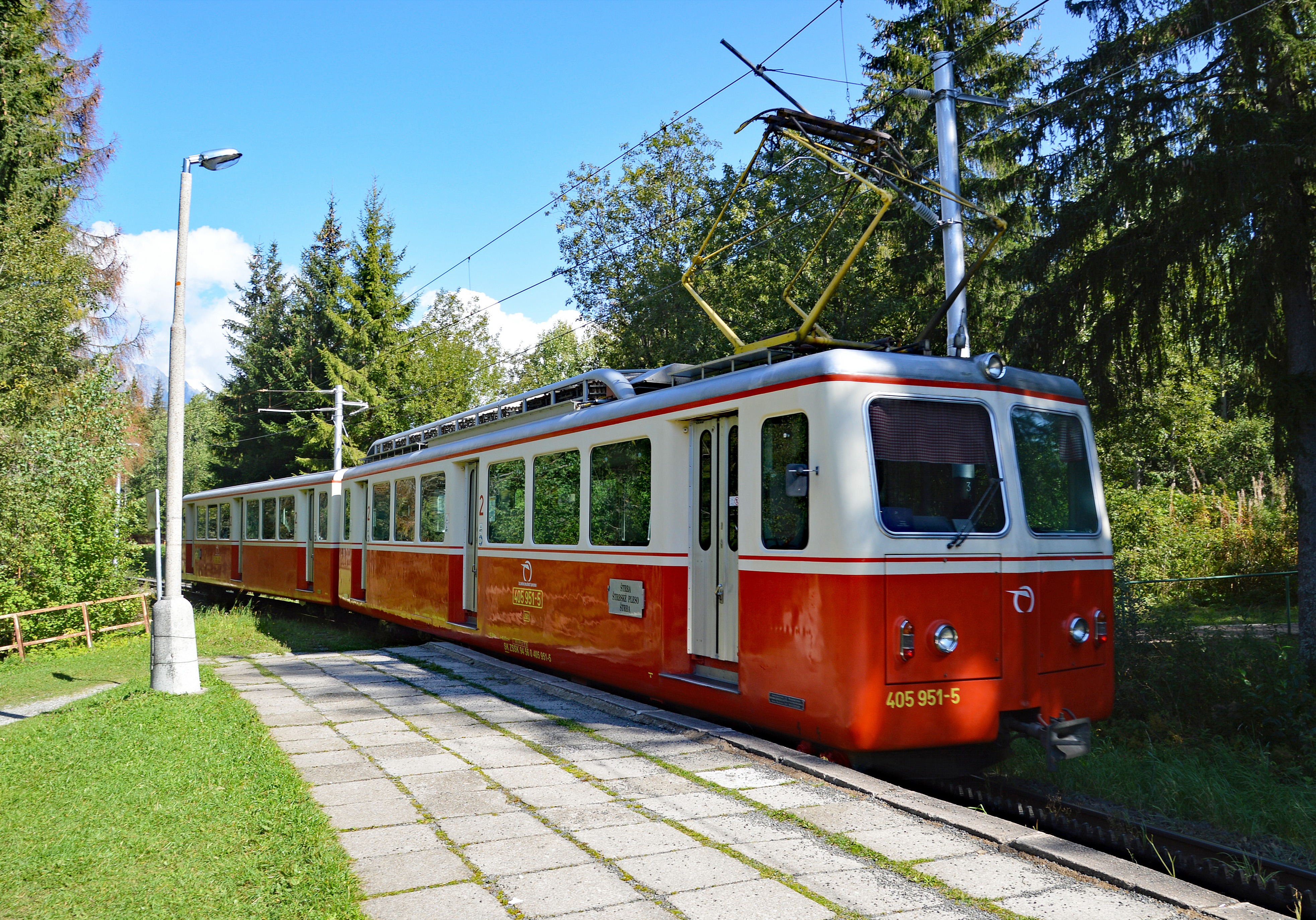 Zahnradbahn Štrba-Štrbské Pleso oder Tschirmer-Bahn in der Hohen Tatra System Von Roll eröffnet zur Nordischen Schi-WM 1970. Zug mit Triebwagen 405.951 mit Steuerwagen 905.951 abfahrbereit zum Tschirmer-See oder Štrbské Pleso.