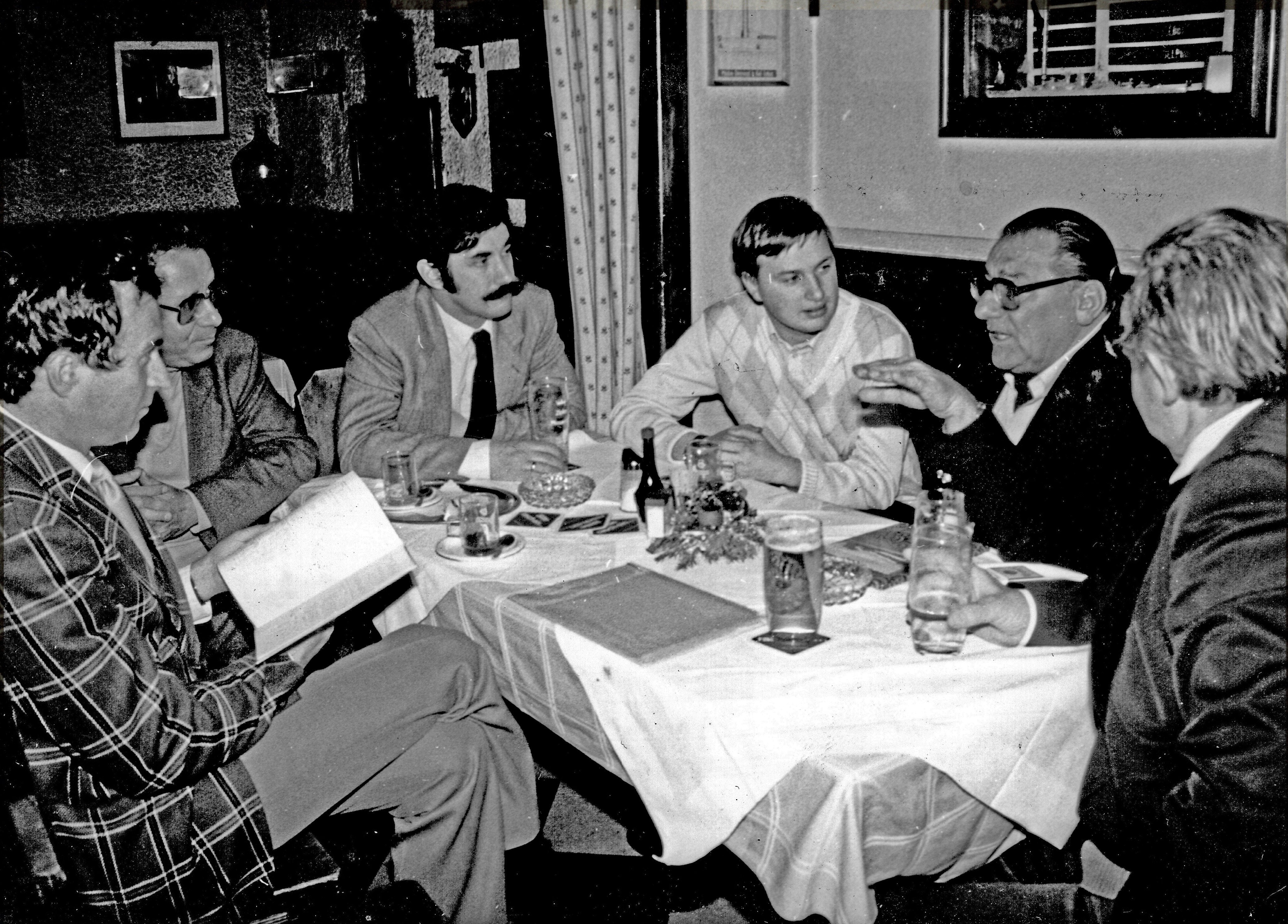 Sozusagen als "konspirative Sitzung" für die Unterschriftenaktion trafen sich im Marinestüberl im Gasthof Itzlinger Hof die Aktivisten der "Aktionsgemeinschaft Rettet die Rote Elektrische" mit Lokalbahn-Direktor DI Wilhelm Staudinger. v.l.: Dr. Karl Schambureck, Ing. Max Wagner, Ing. Sepp Weiser, Gunter Mackinger, Direktor Dipl.-Ing. Wilhelm Staudinger und Alois Fuchs. Fotograf war Richard Fuchs