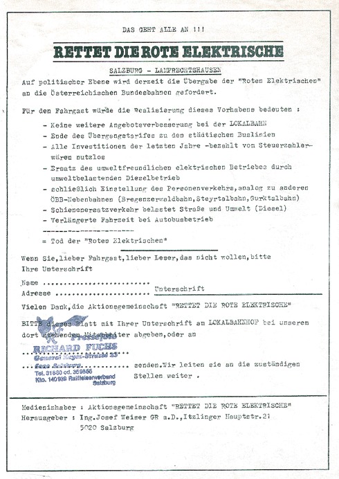 17.12.1982 bestiegen die Aktivisten der Aktionsgemeinschaft "Rettet die Rote Elektrische" den ersten Lokalbahnzug Richtung Lamprechtshausen. Die ankommenden Pendler übergaben am Lokalbahnhof in Salzburg bereits die unterzeichneten Flugblätter.