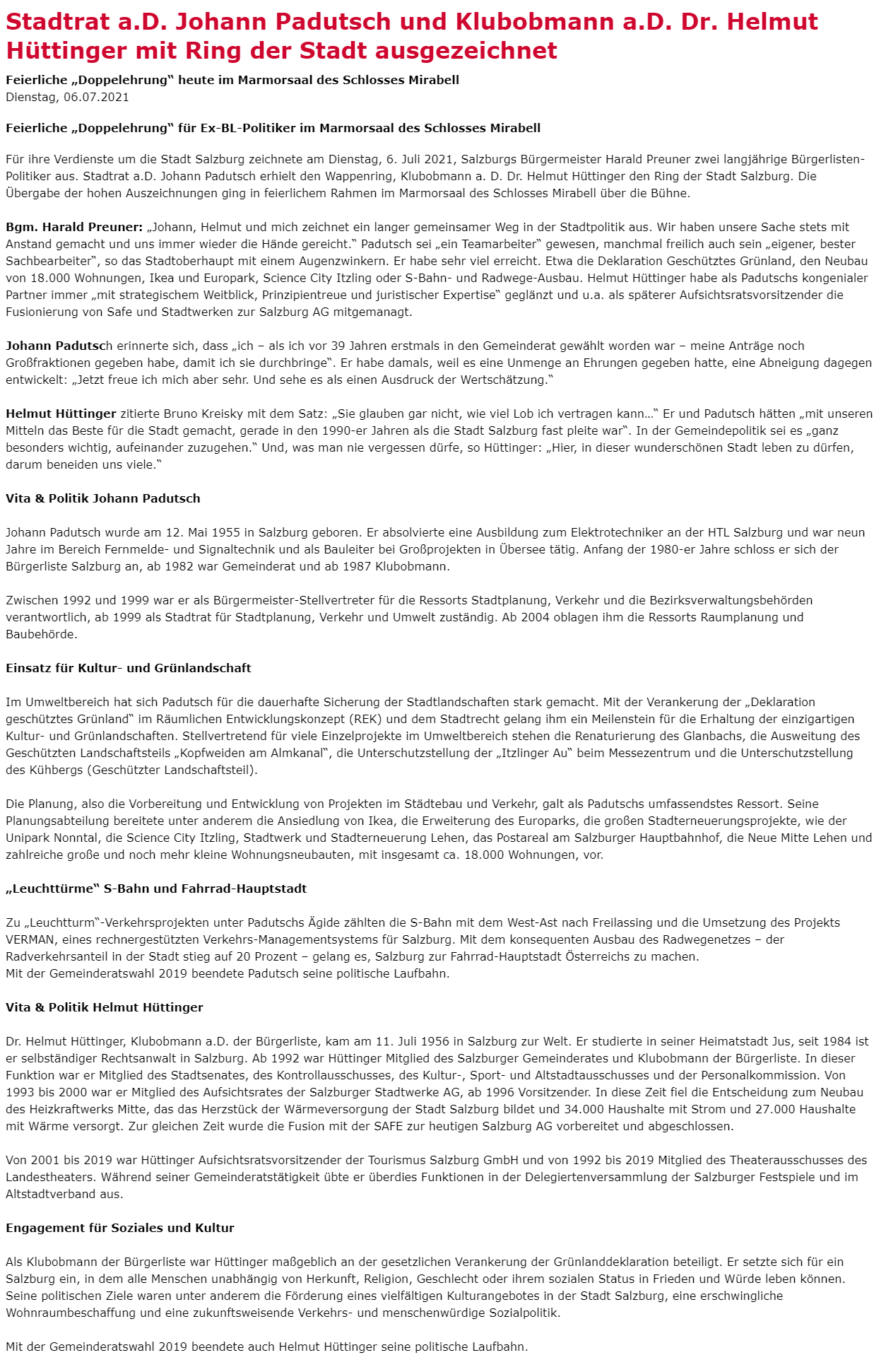Für ihre Verdienste um die Stadt Salzburg zeichnete am Dienstag, 6. Juli 2021, Salzburgs Bürgermeister Harald Preuner zwei langjährige Bürgerlisten-Politiker aus. Stadtrat a.D. Johann Padutsch erhielt den Wappenring, Klubobmann a. D. Dr. Helmut Hüttinger den Ring der Stadt Salzburg. Die Übergabe der hohen Auszeichnungen ging in feierlichem Rahmen im Marmorsaal des Schlosses Mirabell über die Bühne.