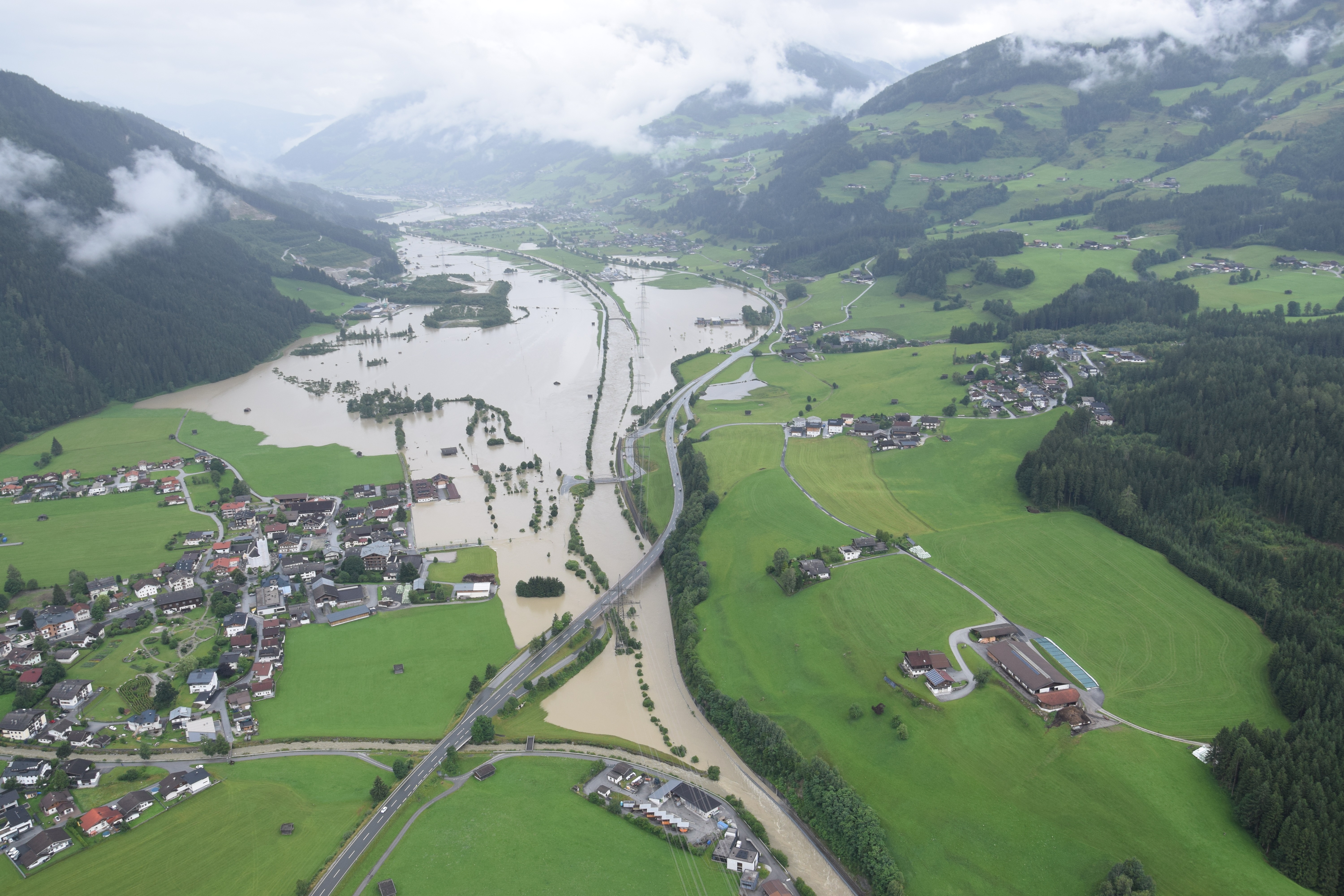Hochwasser im Oberpinzgau. Weite Teile stehen Unterwasser. Zahlreiche Straßensprerren sind die folge. Auch der Bahnverkehr der Pinzgauer Lokalbahn wurde unterbrochen, die Gleise stehen unter Wasser. Nahe Mittersill.
