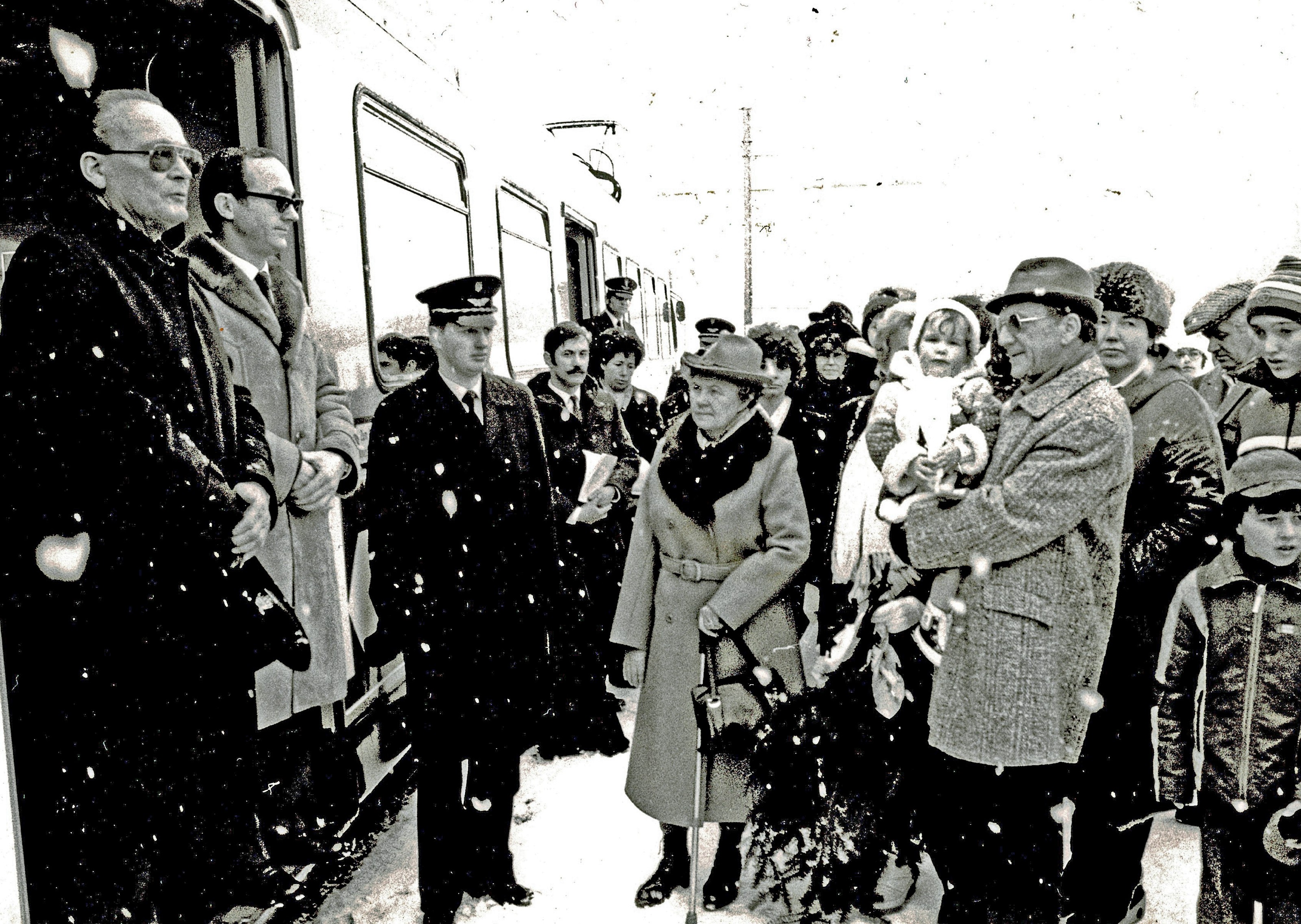 Eröffnung Haltestelle "Oichtensiedlung" Salzburger Lokalbahn 24.12.1982 v.l.: Bürgermeister Oberndorf Dr. Raimund Traintinger, Lokalbahn-Direktor Dr. Josef Riedl, Betriebsleiter Gunter Mackinger