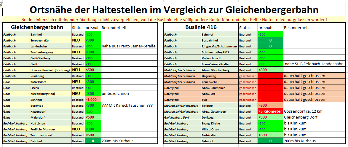 Ortsnähe Haltestellen Gleichenberger Bahn & Bus 416, Haltestellen-Entfernungen