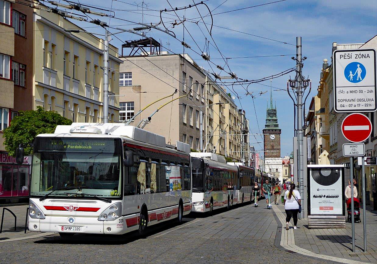 • Parade von Trolleybussen in Tr.Miru mit Skoda 24TR 320 gebaut 2007 vorne • "... sogar ein 3-Achser -Trolleybus ist ein echter Trolleybus", hier Skoda 28TR gebaut im Jahr 2011 hier auf Linie 70 • Pardubice 425 - Skoda 32TR/2019, eines der neuesten Mitglieder im Fahrpark
