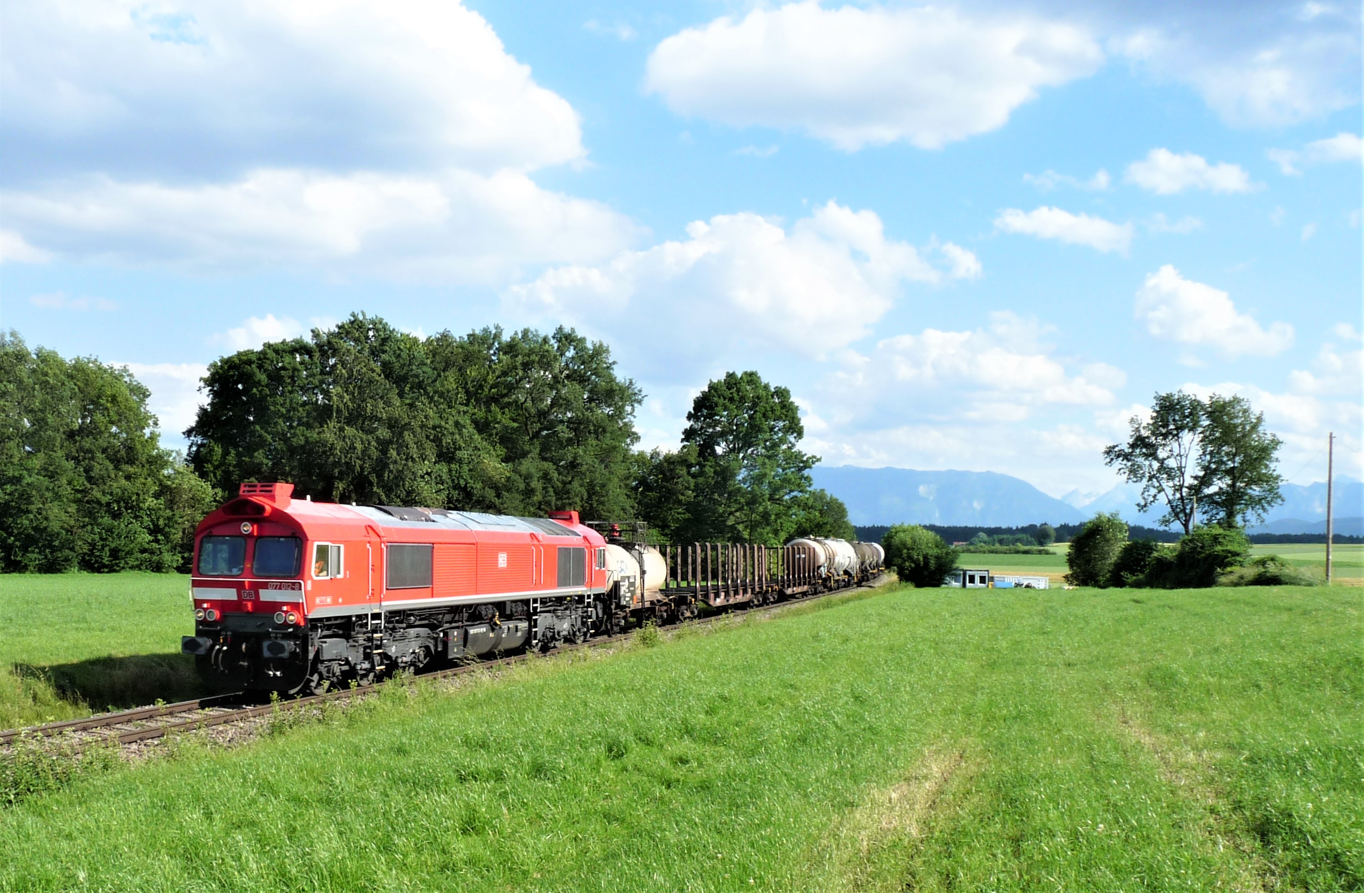 Gezogen werden die Umleitungszüge meistens von den nach Form und Farbe an Schuhschachteln erinnernden weißen Mühldorfer Class 77-Loks so wie dieser am Nachmittag des 11. Juni kurz vor dem ehemaligen Haltepunkt Gastag aufgenommene Richtung Salzburg fahrende Zug.