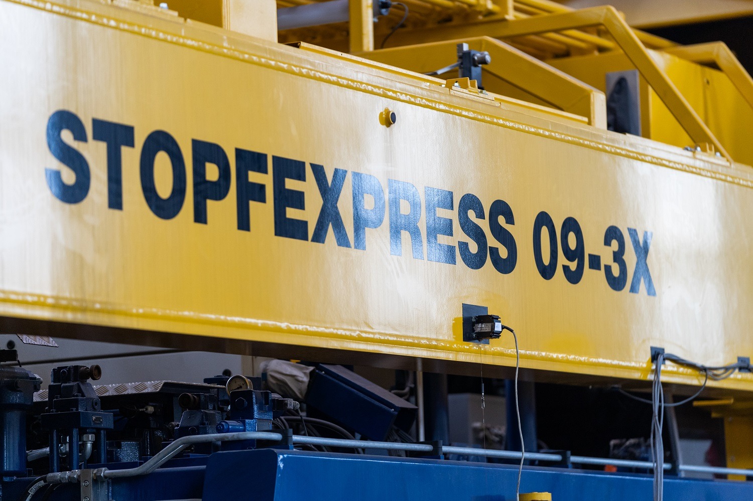Die statischen Festigkeitsversuche nach EN12663-1 für den Gleisstopfexpress 09-3X von Plasser & Theurer wurden im Werk in Linz durchgeführt. Credit: Plasser & Theurer, honorarfrei PJM führt als akkreditierte Prüfstelle nach ISO/IEC 17025 Messungen, Tests und Analysen für die Zulassung von Schienenfahrzeugen und Gleisbaumaschinen durch. Credit: Manuel Hanschitz, honorarfrei Gleisstopfmaschine 09-3X Plasser & Theurer: 80 Tonnen Eigengewicht, 35 m Länge, 8 Achsen und 3-Schwellen-Stopfaggregate. Credit: Plasser & Theurer, honorarfrei
