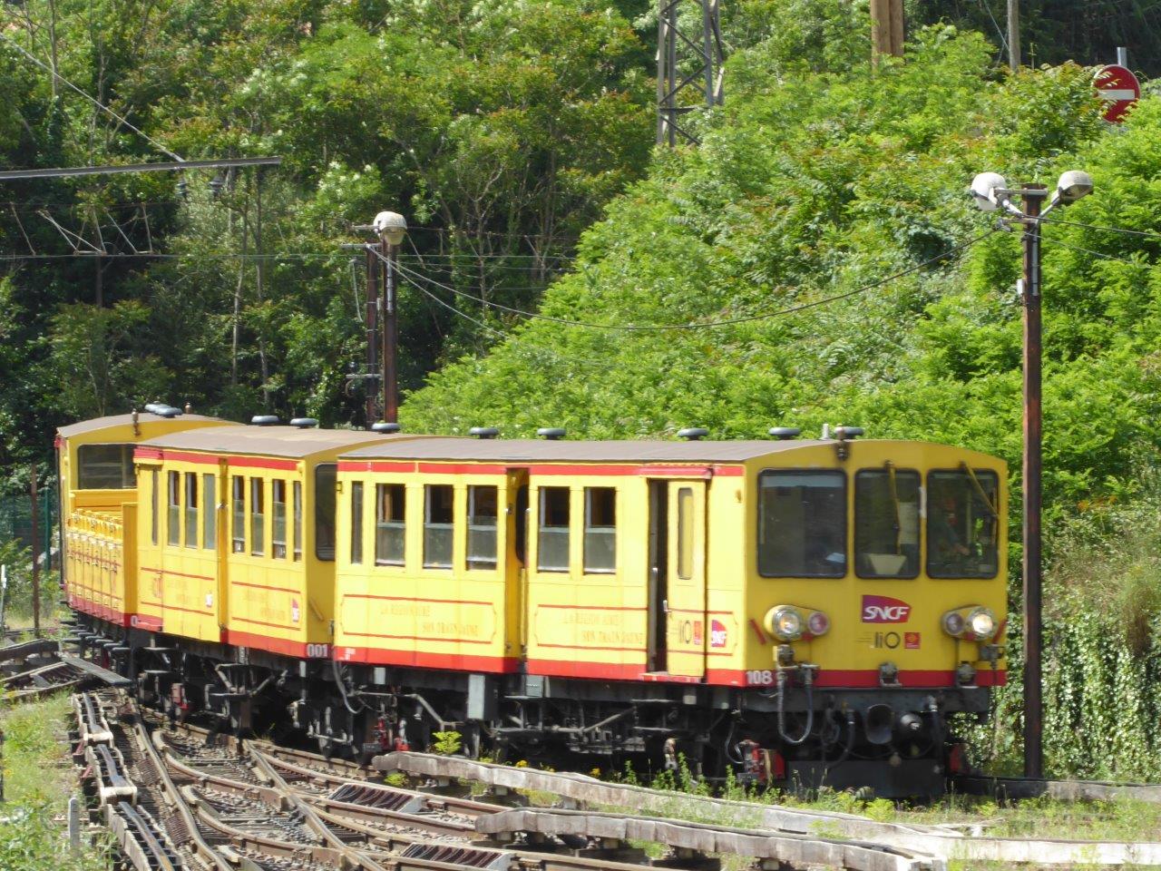 Ein Zug mit Z 108 (Bj. 1908; Carde&Cie/Thomson Houston) an der höchste Stelle im französischen Eisenbahnnetz bei Boiquere-Eyne auf knapp unter 1600 Höhenmetern. Das gemauerte, 237m lange Viaduc Sejoume nahe Thues-Carenca. Zugkreuzung in Planes - links Z 118 (1921 Umbau aus Beiwagen), rechts Z 108 (Bj. 1908).