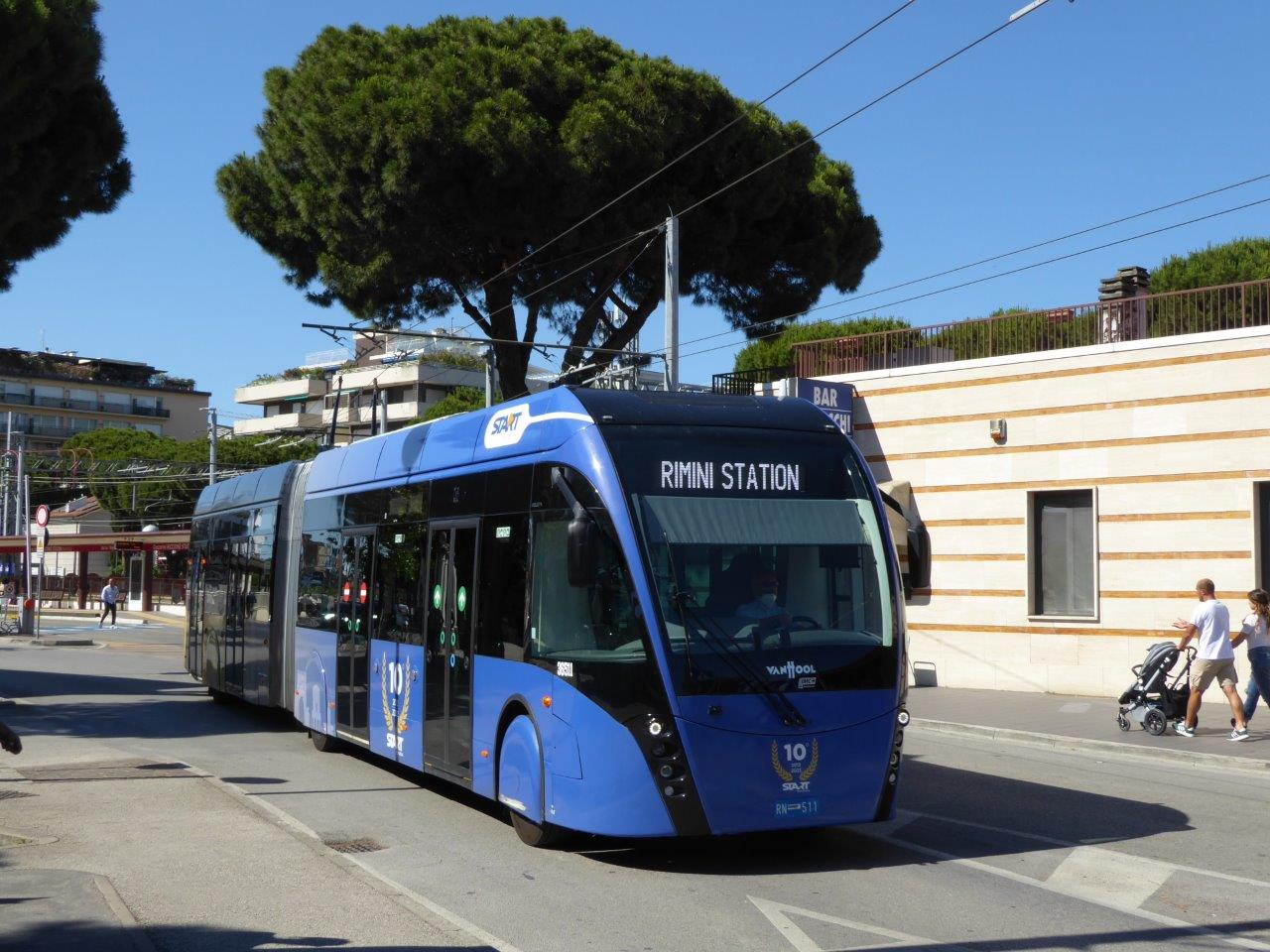 The Rimini – Riccione TBRT line is the first step of a new efficient trolleybus system in and around Rimini. The next step will bring a further 4,2 km line between Rimini FS and the Rimini fair ground. There are plans for a 3rd step (Santarcangelo di Romaga, about 8 km) and a 4th step (Riccione – Cattolica even about 8 km).