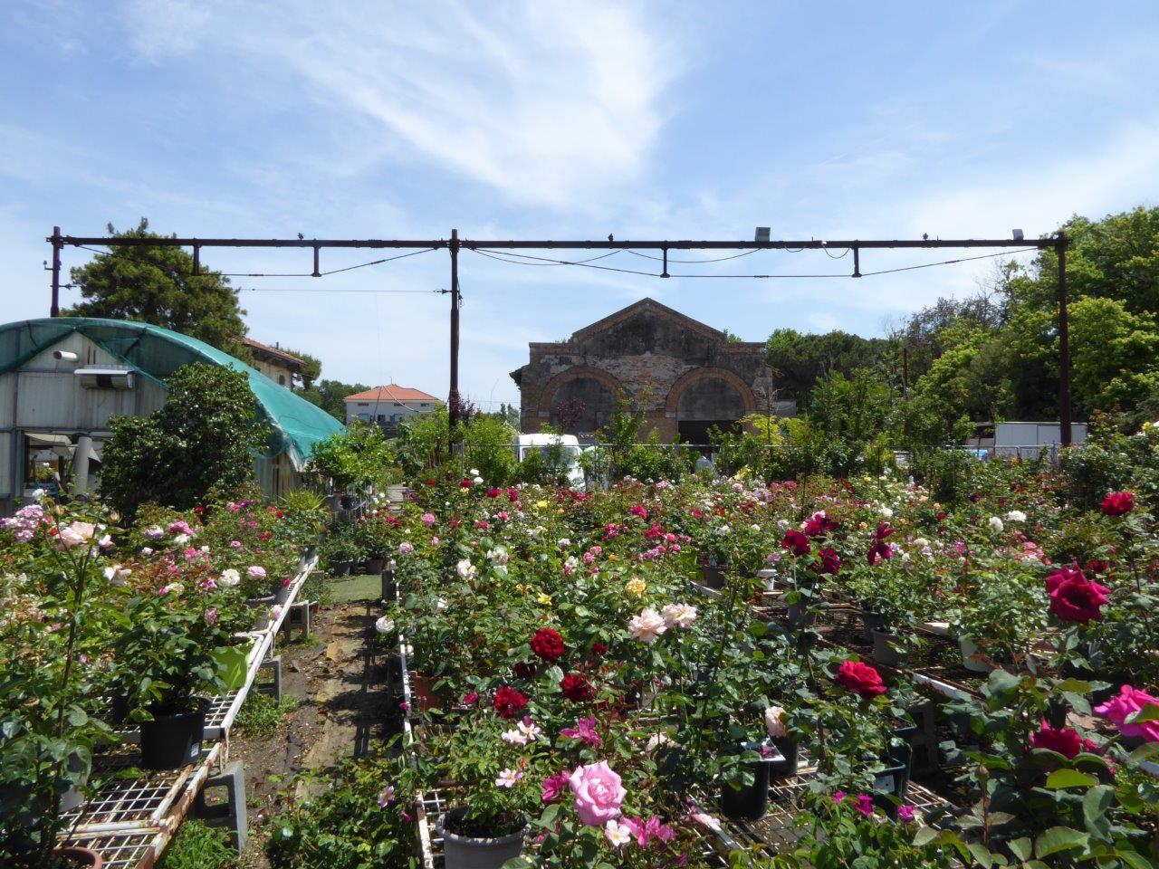 An vielen Orten findet man noch Relikte der Bahn - die Abtragung erfolgte nur jeweils anlassbezogen - hier der frühere Betriebsbahnhof Rimini Marina mit Remise und Werkstätte, heute ein Blumenmeer einer Gärtnerei.