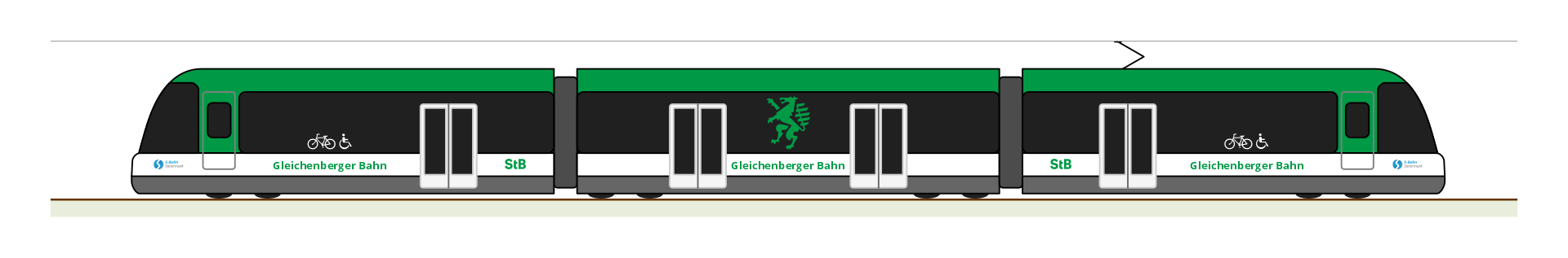 Collage mit der Visualisierung eines VDV-TramTrain in der Lackierung der Gleichenberger Bahn als Vision für die Zukunft unter Hinweis auf die Klimafreundlichkeit der Gleichenberger Bahn