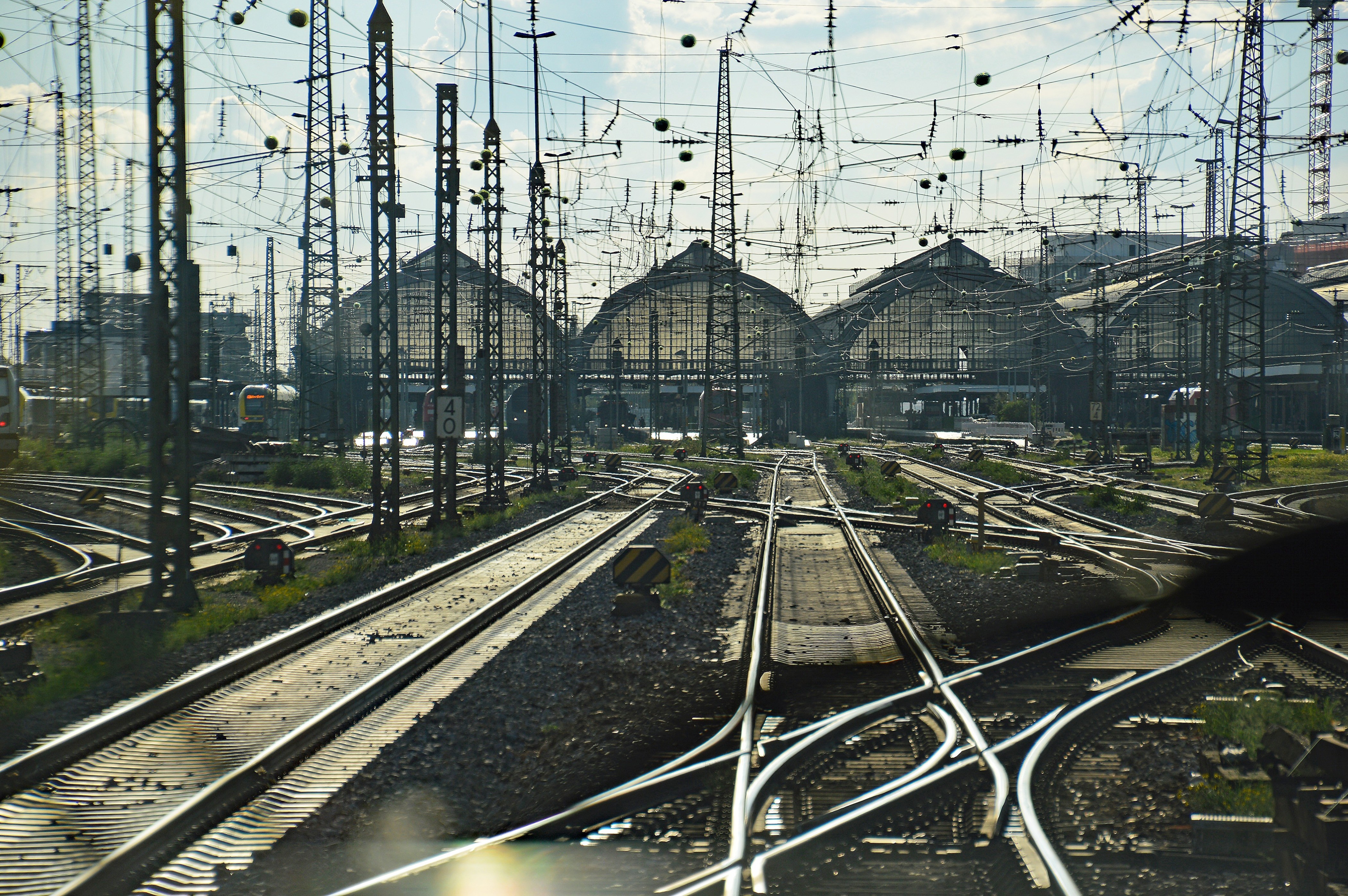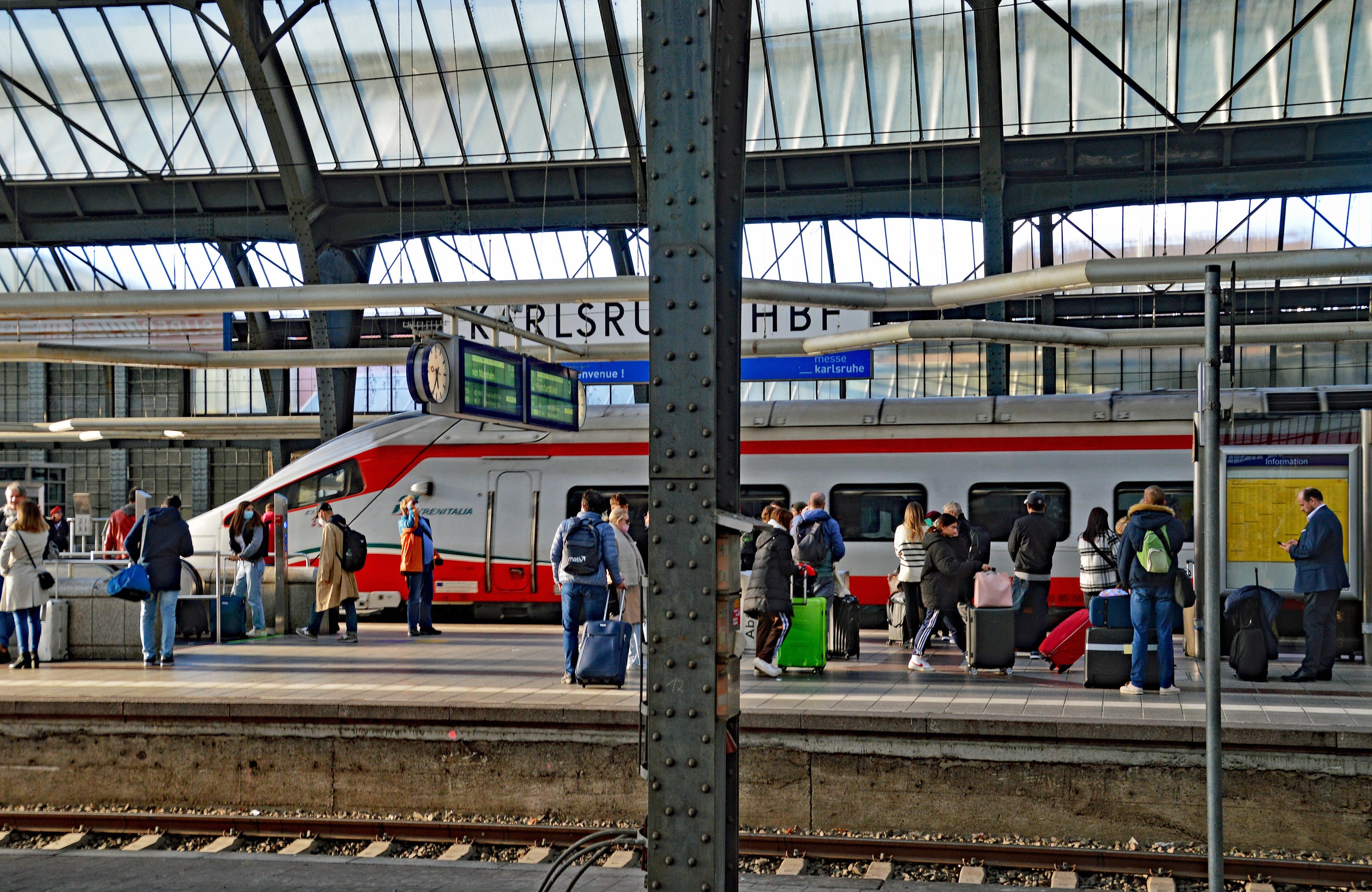 Die Einfahrt in die imposante Bahnhofshalle von Karlsruhe Hauptbahnhof