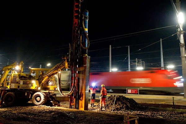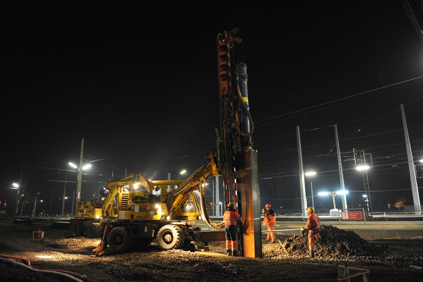 Rammarbeiten setzen von Oberleitungsmasten in der Nacht. © ÖBB, Christian Zenger.