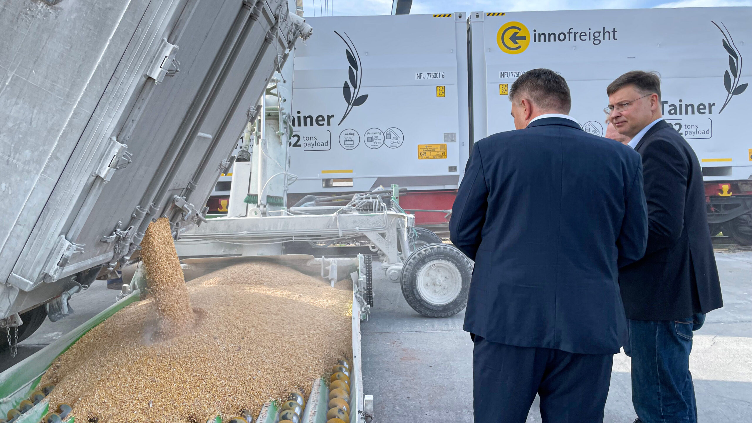 Vergangene Woche besuchte Valdis Dombrovskis, Vizepräsident der Europäischen Kommission, das Transportterminal Dobrà in der Slowakei. Während seines Besuchs wurden unsere GrainTainer beladen, um die Möglichkeiten des Getreidetransports auf der Schiene zu zeigen. Mit unserem modularen System kann der beladene Container sowohl auf der Breit- als auch auf der Normalspur eingesetzt werden – es muss lediglich der Waggon gewechselt werden. Dies verkürzt die Be- und Entladezeiten und kann die Transportabläufe beschleunigen. Hier ein kurzer Überblick über unsere Transportlösungen: