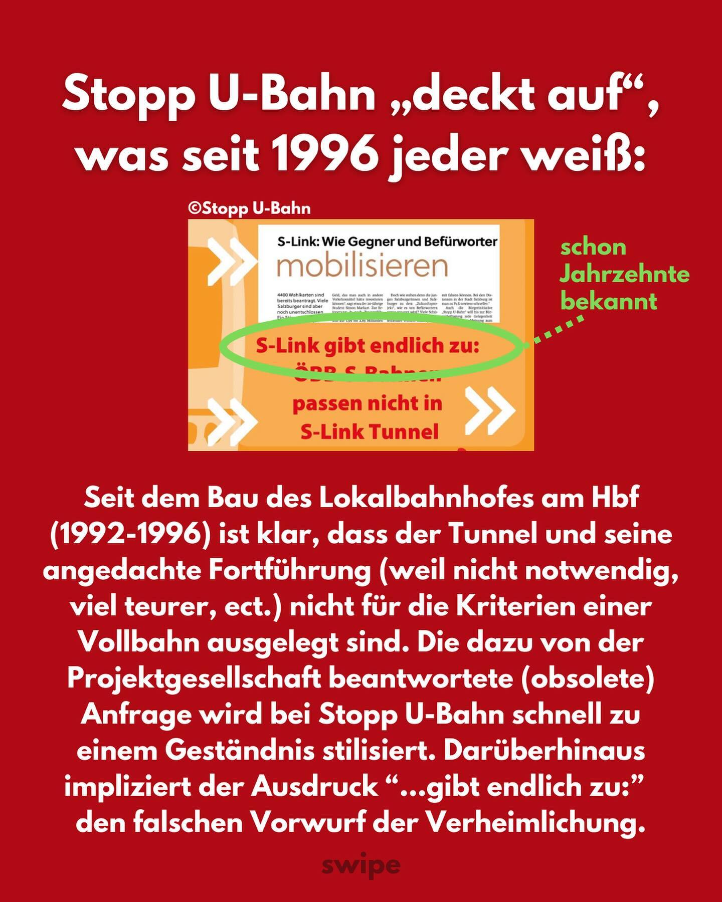 Stopp U-Bahn „deckt auf“, was seit 1996 jeder weiß: Seit dem Bau des Lokalbahnhofes am Hbf (1992-1996) ist klar, dass der Tunnel und seine angedachte Fortführung (weil nicht notwendig, viel teurer, ect.) nicht für die Kriterien einer Vollbahn ausgelegt sind. Die dazu von der Projektgesellschaft beantwortete (obsolete) Anfrage wird bei Stopp U-Bahn schnell zu einem Geständnis stilisiert. Darüberhinaus impliziert der Ausdruck “...gibt endlich zu:” den falschen Vorwurf der Verheimlichung.