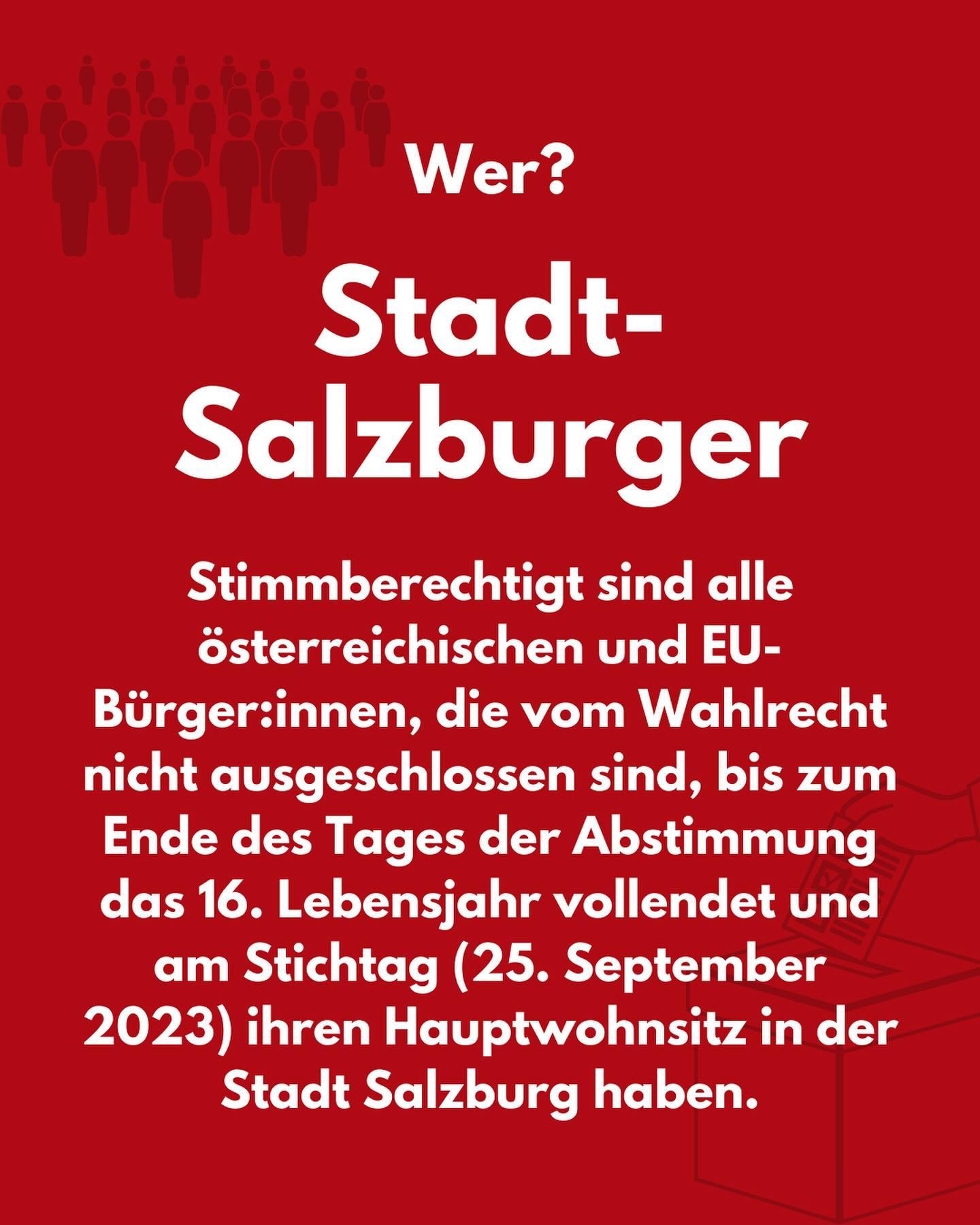 Stimmberechtigt sind alle österreichischen und EU-Bürger:innen, die vom Wahlrecht nicht ausgeschlossen sind, bis zum Ende des Tages der Abstimmung das 16. Lebensjahr vollendet und am Stichtag (25. September 2023) ihren Hauptwohnsitz in der Stadt Salzburg haben.