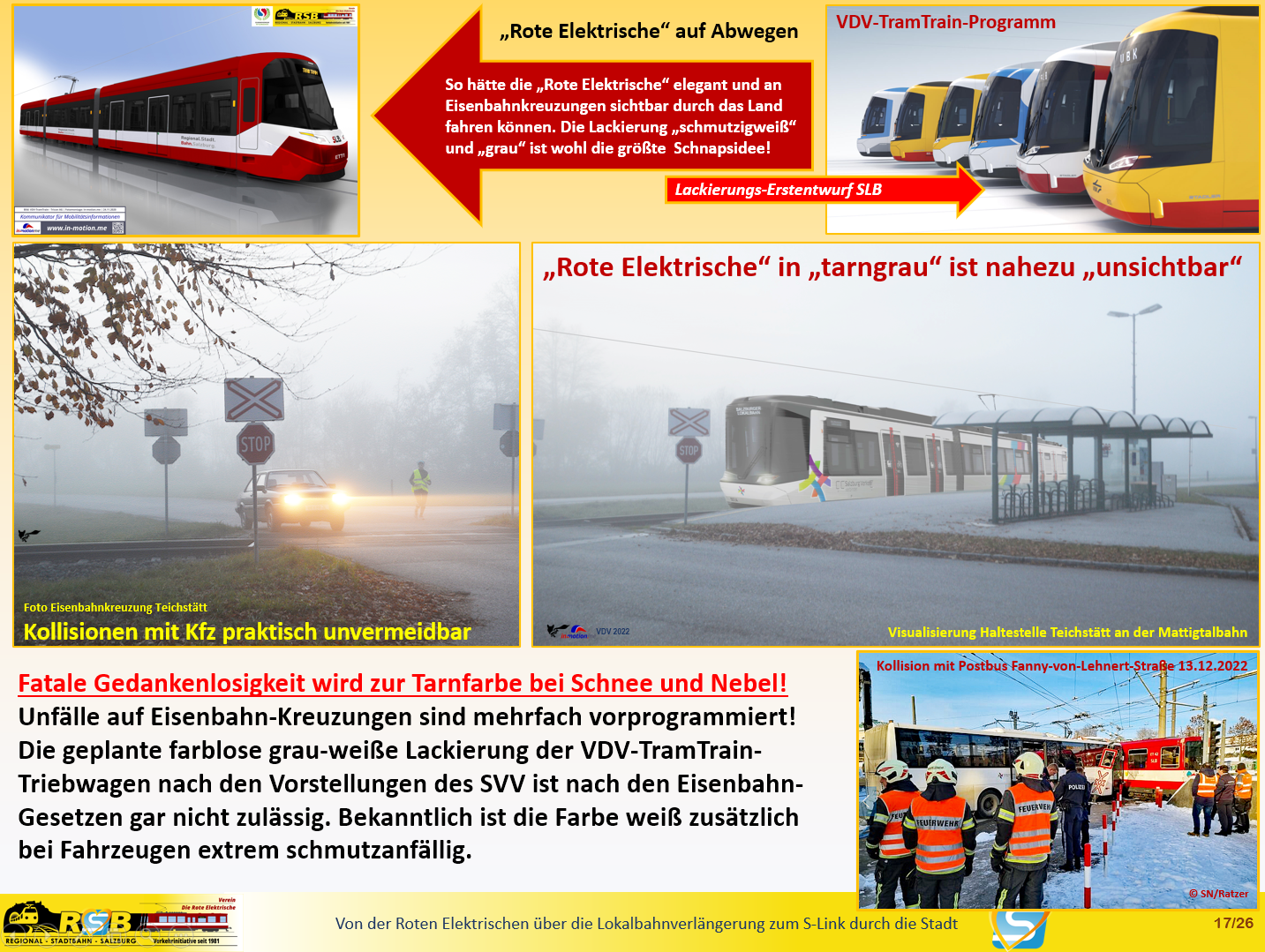 Manchmal überkommt einem doch das Gefühl, dass es in der Verkehrsplanung Personen gibt, die vor lauter Inkompetenz nicht wissen, was sie tun. Vielleicht will aber jemand dem Öffentlichen Verkehr das wachsende positive Image rauben, um den Autoverkehr zu fördern. Vielleicht ist es aber einfach nur Dummheit. Bereits vor 120 Jahren hat sich jemand, vermutlich Direktor Ing. Karl Petri, Gedanken darüber gemacht, wie man die damals neuen Triebwagenzüge auf den Straßen durch die rote Lackierung besser sichtbar machen kann. Seit damals ist die Salzburger Lokalbahn, damals noch SETG (Salzburger Eisenbahn- und Tramway-Gesellschaft) in der Bevölkerung besser als "Rote Elektrische" bekannt. Jetzt will man mit einer nichtssagenden unansehnlichen weiß-grau-schmutzigen Grundierungsfarbe der Postbusse auch noch der Salzburger Lokalbahn ihre Identität rauben. Damit erhält die Salzburger Lokalbahn eine Art "Tarnfarbe" in den nebeligen Herbsttagen, die dann, nach dem ersten Toten an den Eisenbahnkreuzungen, der aus dem zerstörten Auto geschnitten werden muss, ohnehin wieder auf rot lackiert werden muss. Eigentlich könnte man sich diesen Wahnsinn von vorneherein sparen! Vielleicht will man aber einfach nur den öffentlichen Verkehr aus dem Stadtbild und der Landschaft optisch verschwinden lassen? Andererseits sollte man vorab in der Obersten Eisenbahnbehörde im Verkehrsministerium nachfragen, ob so eine "Tarnfarben-Lackierung" überhaupt genehmigungsfähig ist!