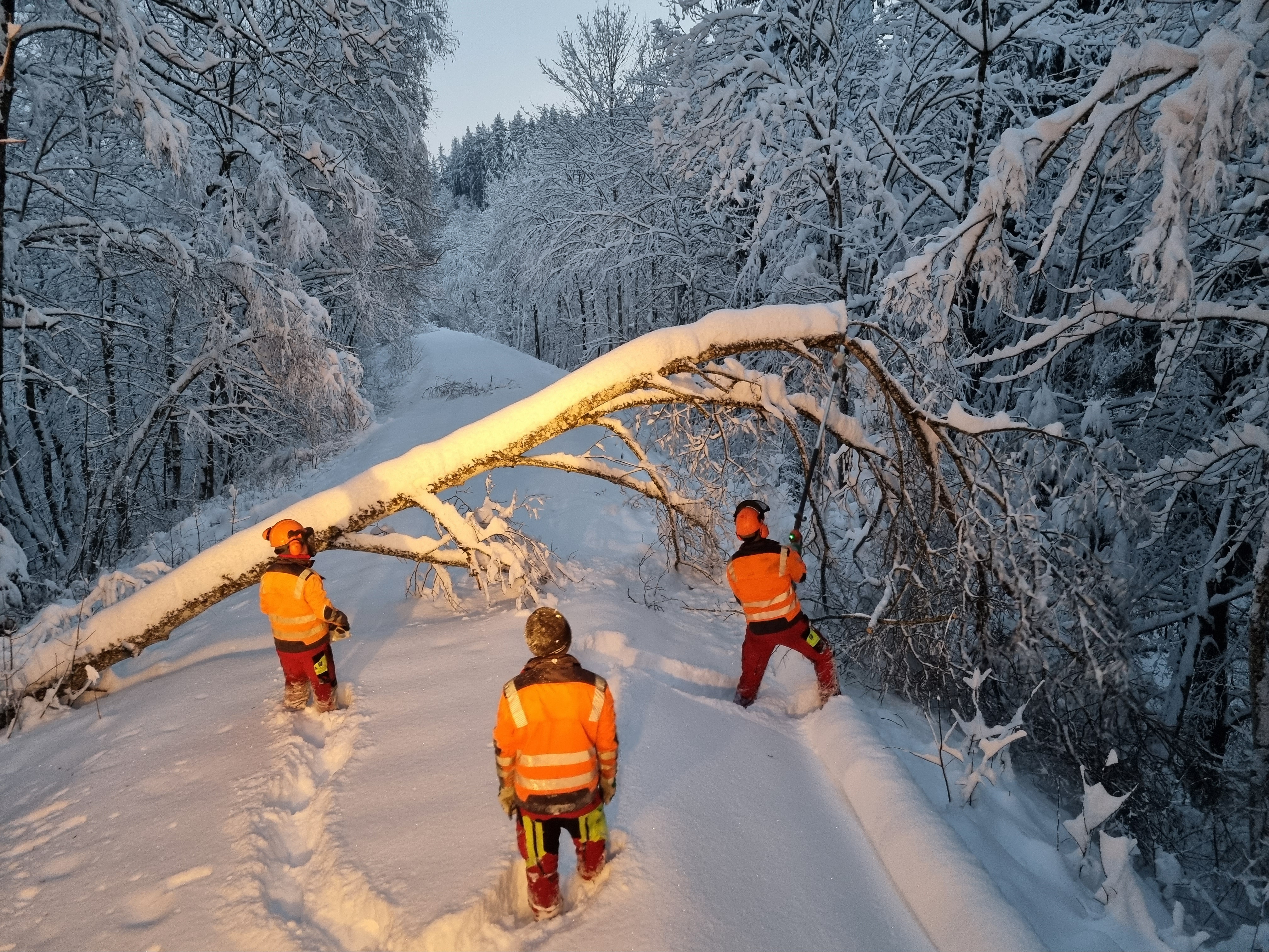 Der starke Schneefall hält seit Freitagabend die Feuerwehren im Land Salzburg auf Trab. Sie mussten zu hunderten Schadensstellen ausrücken – vor allem, um geknickte Bäume wegzuräumen. Schwerpunkte waren der Flachgau und die Stadt Salzburg. Die Bahnstrecke über das Deutsche Eck ist bis mindestens Sonntag geschlossen.