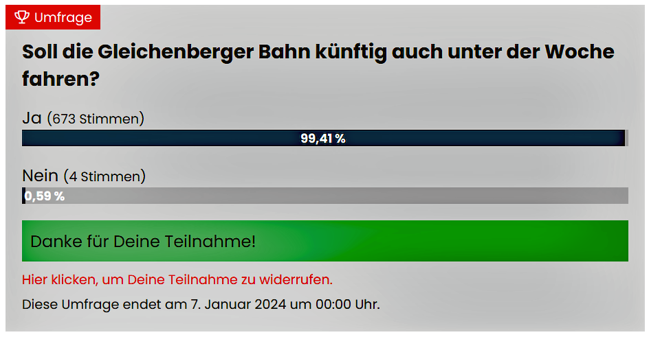 Bei einer Leserbefragung der Zeitung MeinBezirk Südoststeiermark über einen Ganztagesbetrieb auf der Gleichenberger Bahn mit Betrieb über die ganze Woche und das natürlich ganzjährig, stimmten 673 Unterstützer, das sind über 99% für Ja!