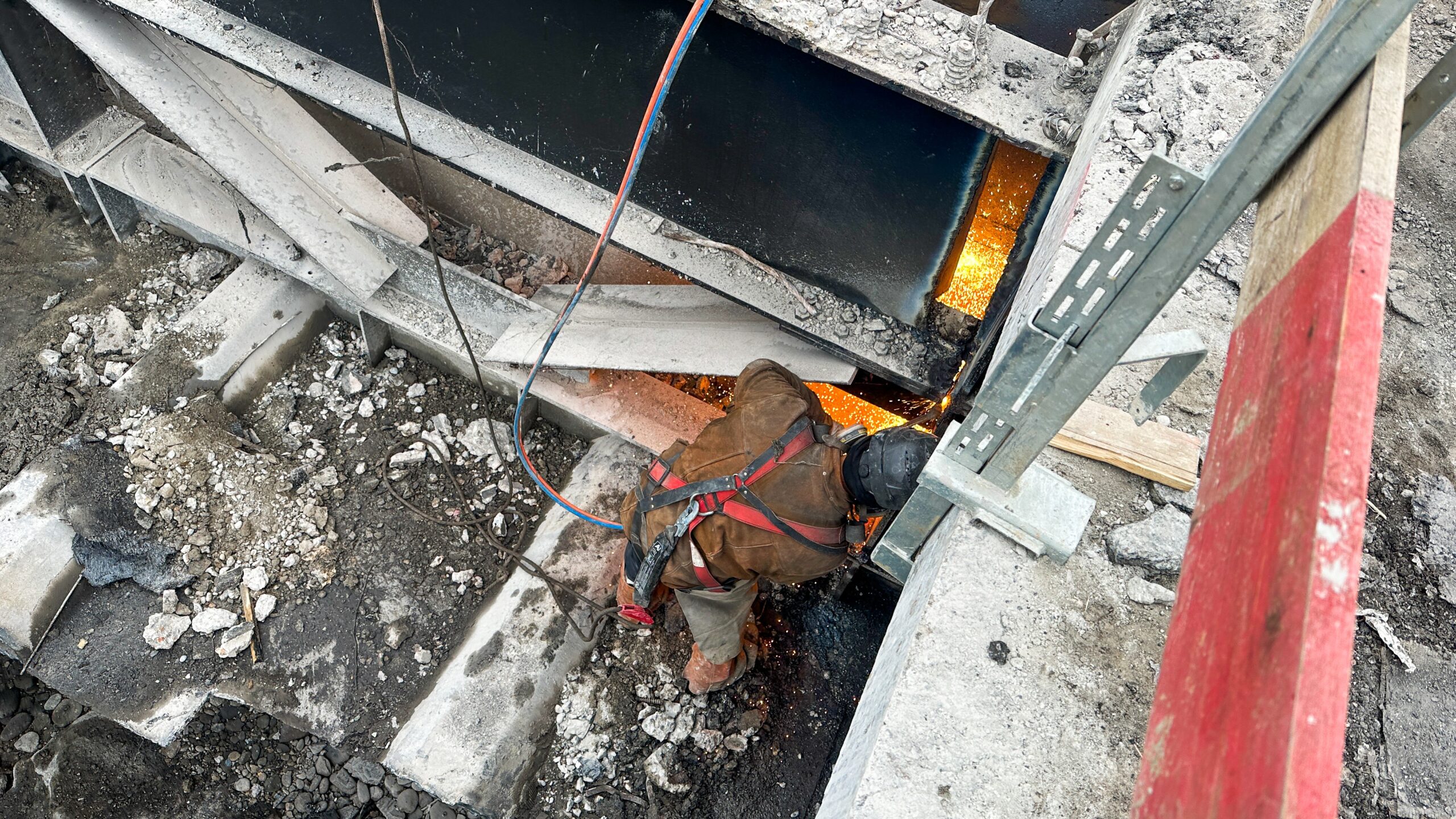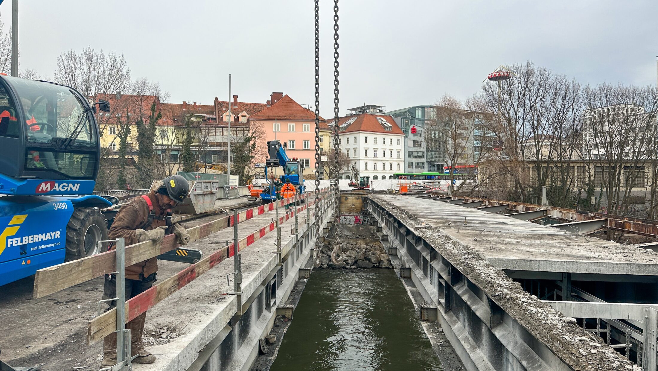 Für die sogenannte „statische Ertüchtigung“ der Brücke werken die Bauarbeiter:innen deshalb seit 8. Jänner auf Hochtouren: Der Asphalt wurde bereits abgefräst, Fahrbahnplatte und Kragarme werden in Teile geschnitten und abtransportiert.