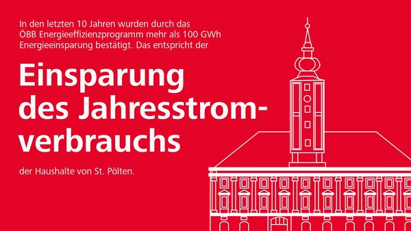 Am morgigen Welt-Energiespartag feiern die ÖBB ein Jubiläum: Seit 10 Jahren laufen ehrgeizige Energiesparprogramme – nach dem Motto: Die klimafreundlichste Kilowattstunde ist die, die erst gar nicht verbraucht wird. Durch intelligente Ideen und Maßnahmen konnten mehr als 100 GWh Energie nachhaltig eingespart werden. Das bestätigen auch externe Auditoren, die die umgesetzten Maßnahmen gemäß Energieeffizienzgesetz geprüft haben. Die eingesparte Energiemenge entspricht in etwa dem Jahresstrombedarf aller Haushalte der niederösterreichischen Landeshauptstadt St. Pölten mit rund 58.000 Einwohner:innen. Und dass trotz steigender Transportleistungen.