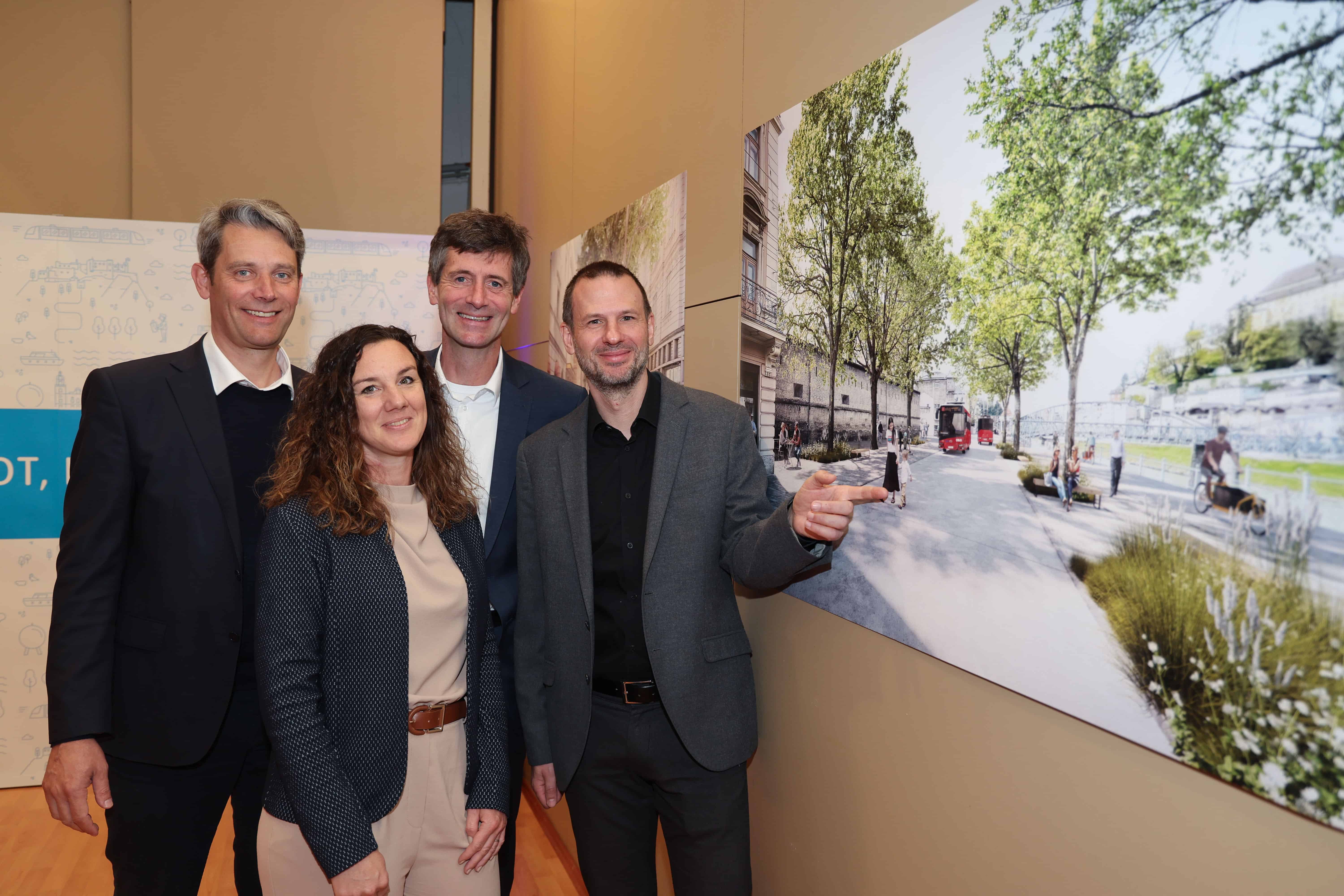 Stefan Knittel (Geschäftsführer S-LINK Projektgesellschaft), Martin Seidel (Group Leader Traffic and Transport Infrastructure, ILF Consulting Engineers), Monika Stöggl (Leiterin Rechtsabteilung S-LINK Projektgesellschaft), Johannes Gfrerer (Geschäftsführer Salzburger Verkehrsverbund) © S-LINK/Neumayr
