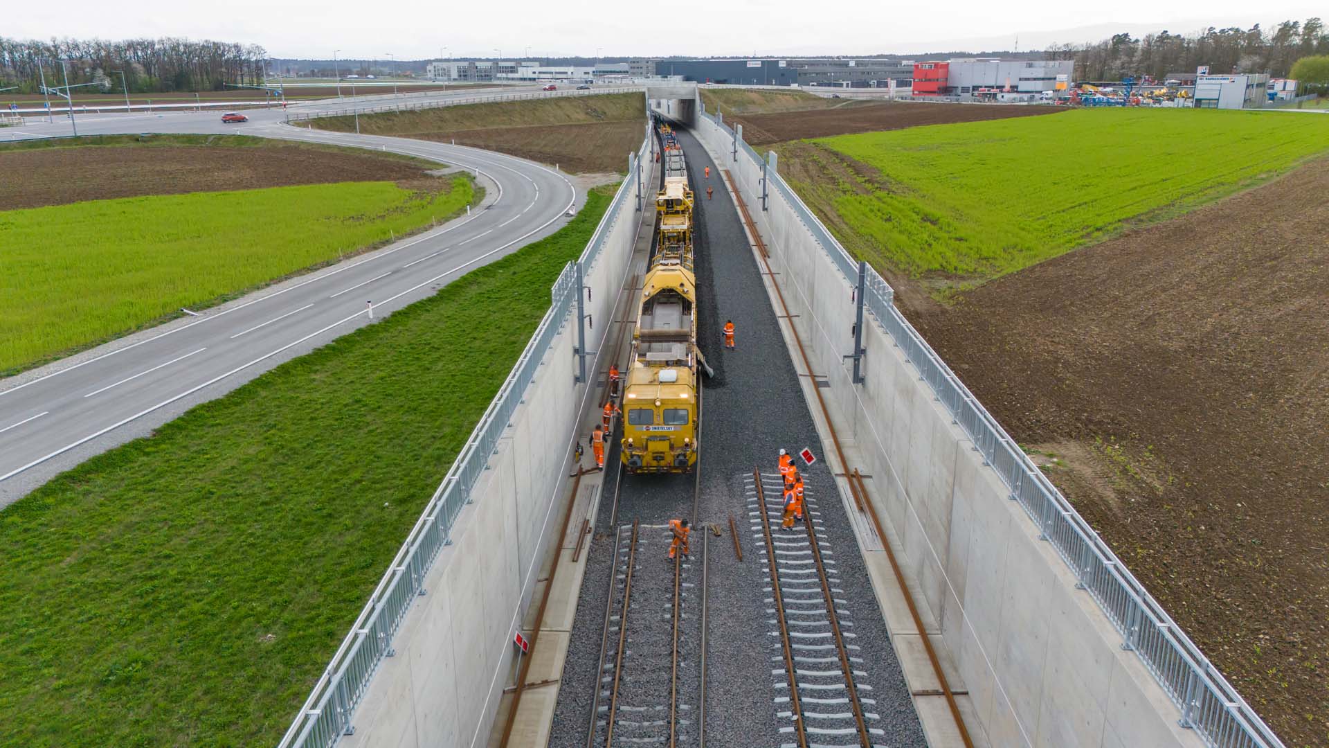 Die Koralmbahn zwischen Feldkirchen und Weitendorf wurde 2020 als letzter großer Abschnitt in Angriff genommen. Anfang April wurde der Gleisbau abgeschlossen. Ab Mai startet bereits die Montage der Oberleitung.