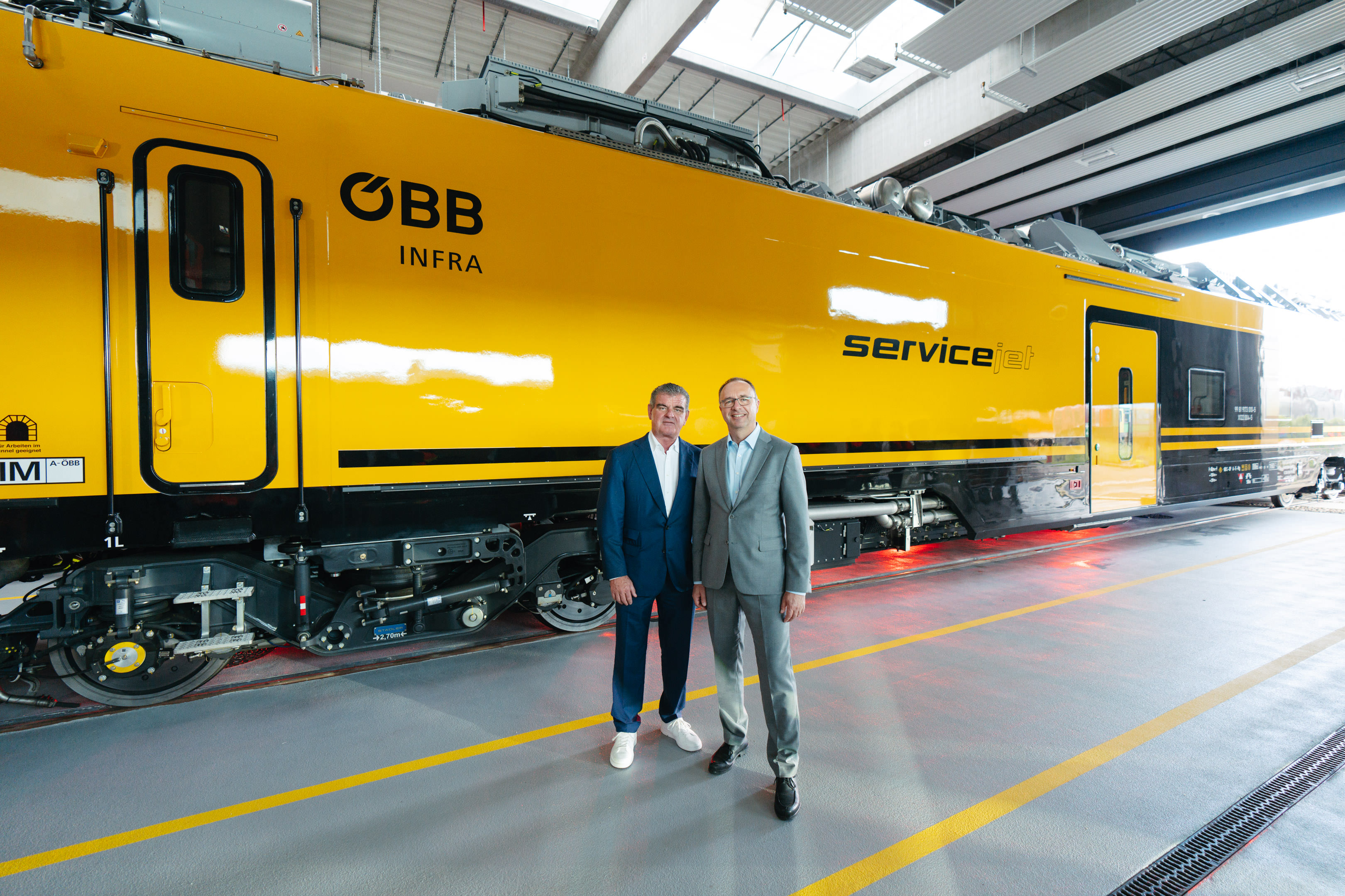 Die zukunftsweisende Erneuerung der Rettungszugflotte der ÖBB-Infrastruktur AG nimmt weiter Fahrt auf. Am 25. August 2023 präsentierten die ÖBB und Stadler den ersten von 18 neuen sogenannten Servicejets. © ÖBB