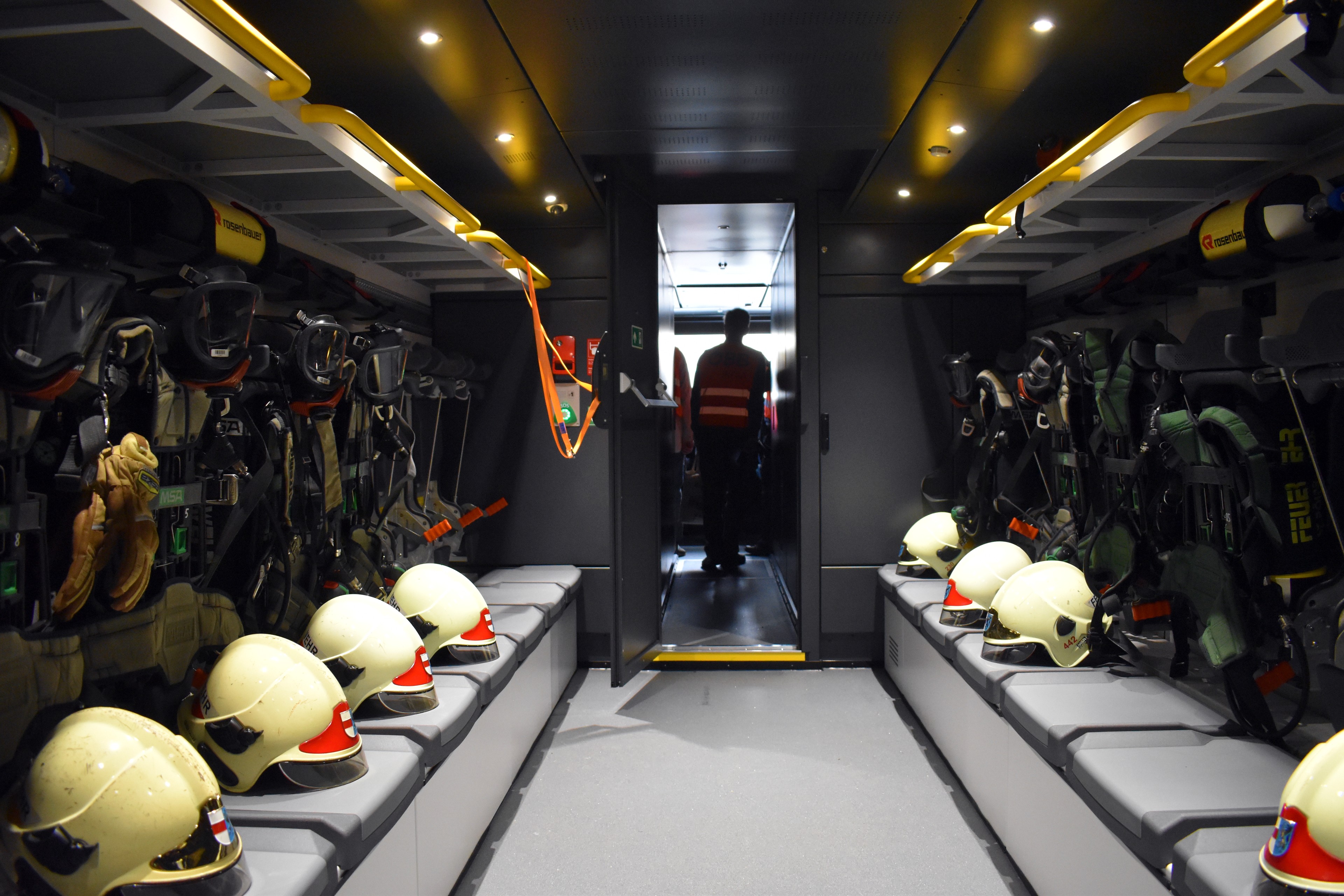 Der neue Stadler Rettungstriebzug ist ein einsatztaktisches Multitalent. Er muss für den Worst Case, einen Lösch- und Rettungseinsatz in einem Eisenbahntunnel, gerüstet sein, nimmt bei Evakuierungen die Fahrgäste aus anderen Zügen auf und wird auch für Instandhaltungsarbeiten genutzt. Im Notfall finden über 300 Menschen in den drei durchgängig von vorne bis hinten begehbaren Waggons Platz. 18 Sitzplätze sind mit Pressluftatmer-Halterungen für Feuerwehrmitglieder ausgestattet. Eine Klimaanlage mit Spezialfiltern schützt die Menschen im Zug vor Rauchgasen. Ausserdem ist die gesamte Zuggarnitur druckertüchtigt, so dass der Innenraum auf einem leichten Überdruck zur Rauchfreihaltung in Tunneln gehalten werden kann. Der vordere Teil des Zuges mit dem Führerstand kann von aussen durch eine Wassersprühanlage geschützt werden.