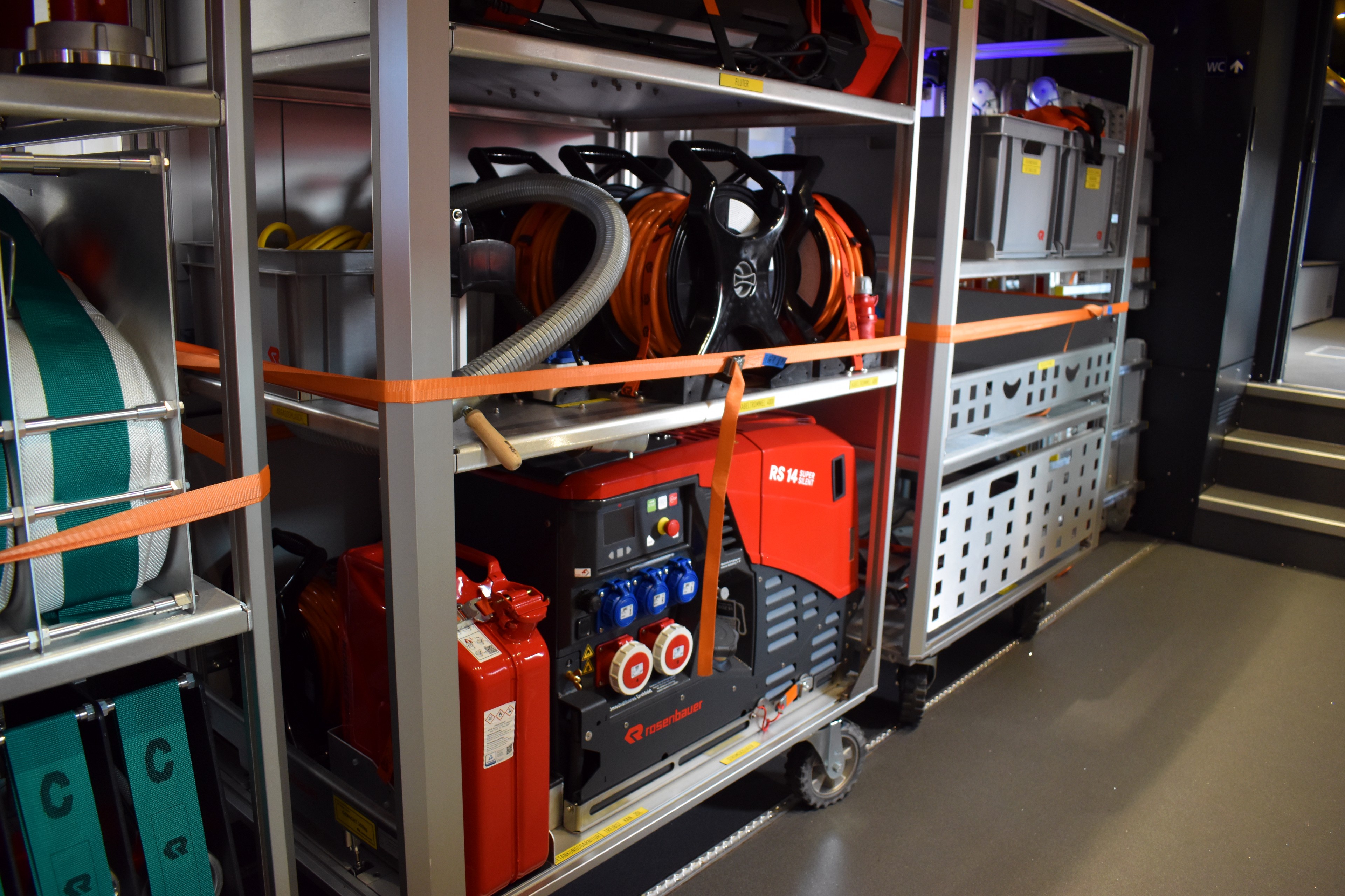 Darüber hinaus kann der Rettungstriebzug mit thematisch zusammengestellten Rollcontainern beladen werden. Die Container transportieren feuerwehrtechnisches Material wie tragbare Pumpen, Ausrüstung zur Waldbrandbekämpfung, Atemschutzgeräte, spezielle Schutzanzüge usw. Bei der ÖBB Infrastruktur stehen die Rollcontainer an den Stützpunkten vollbeladen bereit, werden nach Bedarf in den Zügen verstaut und an den Einsatzstellen über eingebaute Hublifte entladen. So können die Einsatzmannschaften auf unterschiedlichste Szenarien rasch reagieren.