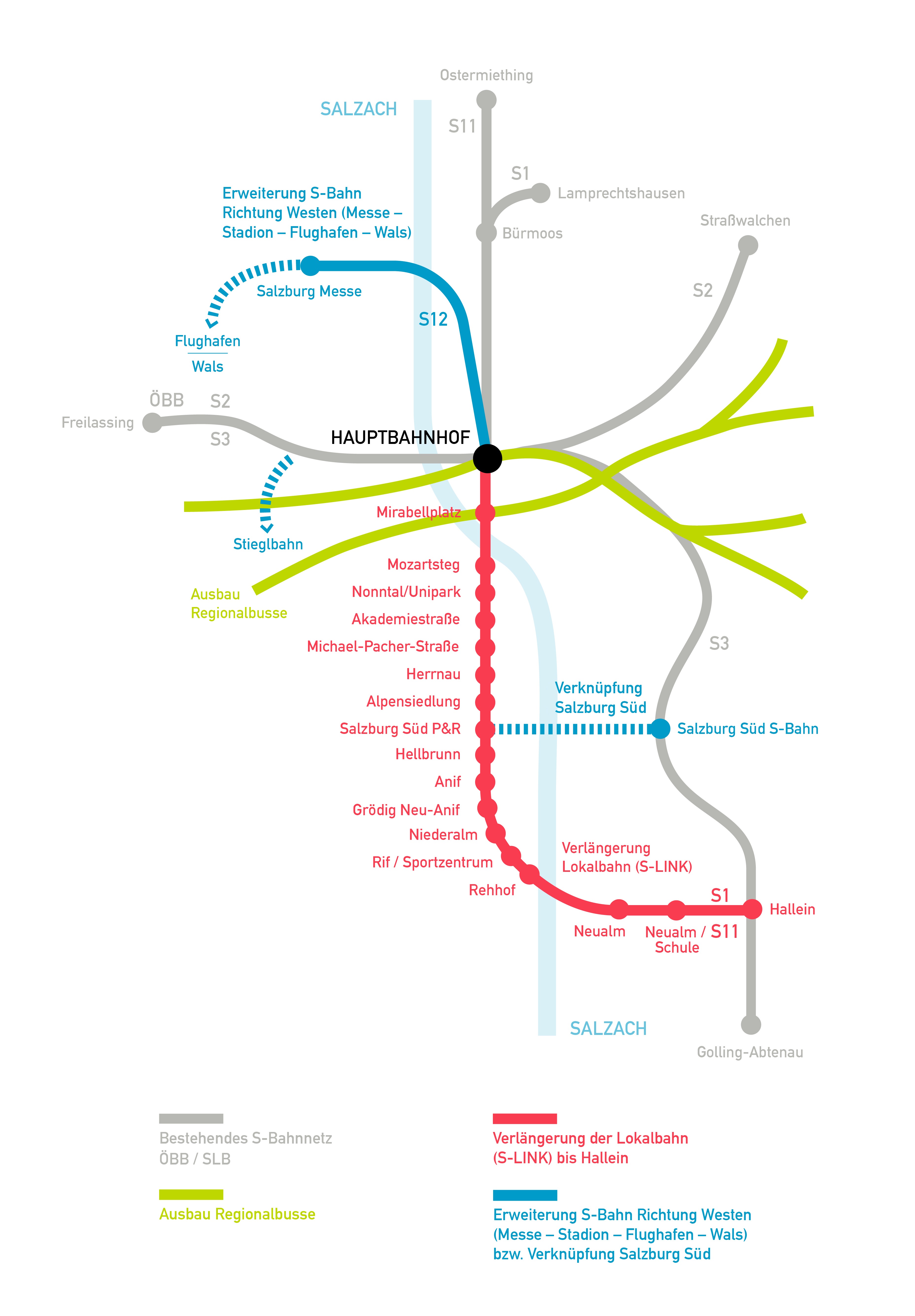 Vereinfachte Darstellung der umfassenden Salzburger Mobilitätslösung mit der Verlängerung der Lokalbahn (S-LINK) bis Hallein in Rot. © Salzburger Verkehrsverbund